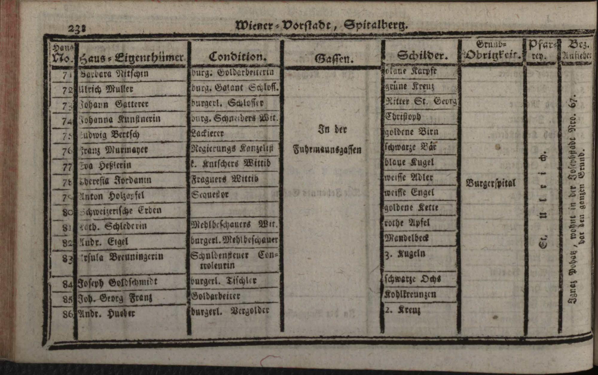 Verzeichniß der in der Kaiserl. Königl. Haupt- und Residenzstadt Wien, sammt dazu gehörigen Vorstädten, und Gründen, befindlichen numerirten Häusern derselben Eigenthümern, und deren Conditionen, Schilderen, Gassen, Grund-Obrigkeiten, Pfarreyen, und derzeit Bezirksaufsehern : auf das genaueste nach denen Grundbüchern entworfen / Von Franz de Ponty