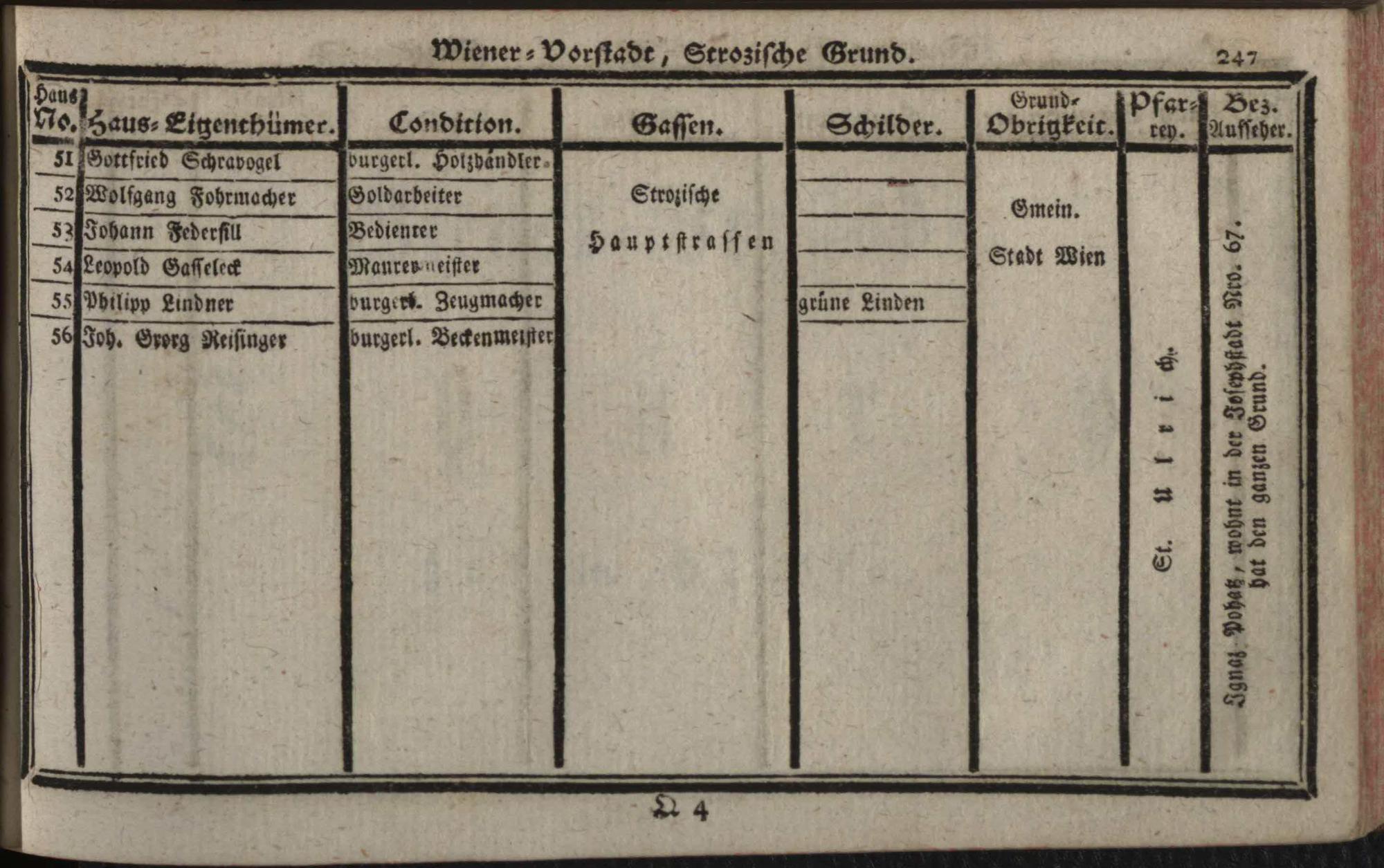 Verzeichniß der in der Kaiserl. Königl. Haupt- und Residenzstadt Wien, sammt dazu gehörigen Vorstädten, und Gründen, befindlichen numerirten Häusern derselben Eigenthümern, und deren Conditionen, Schilderen, Gassen, Grund-Obrigkeiten, Pfarreyen, und derzeit Bezirksaufsehern : auf das genaueste nach denen Grundbüchern entworfen / Von Franz de Ponty
