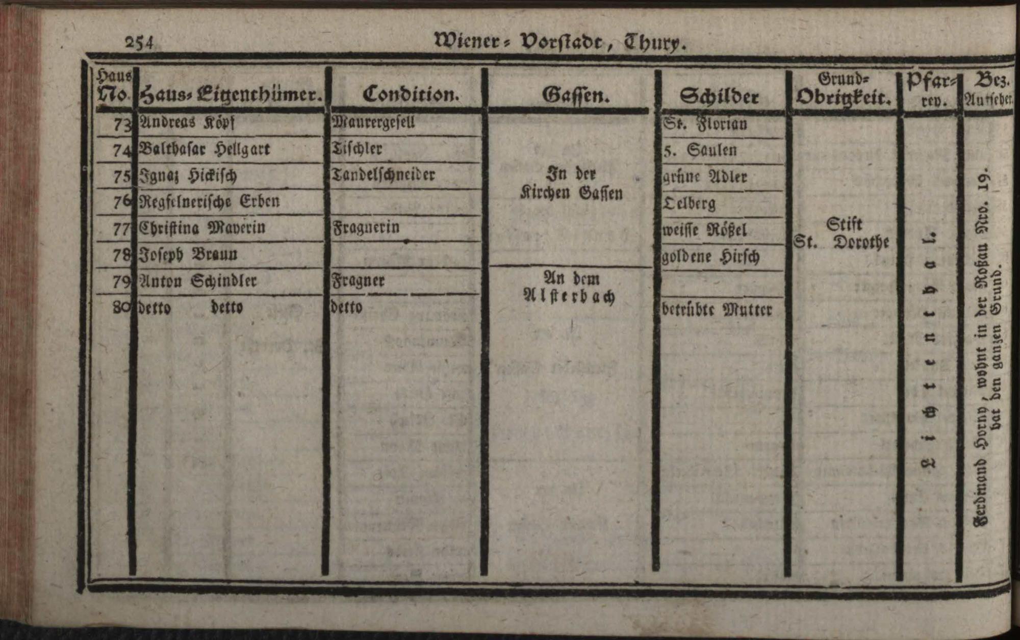 Verzeichniß der in der Kaiserl. Königl. Haupt- und Residenzstadt Wien, sammt dazu gehörigen Vorstädten, und Gründen, befindlichen numerirten Häusern derselben Eigenthümern, und deren Conditionen, Schilderen, Gassen, Grund-Obrigkeiten, Pfarreyen, und derzeit Bezirksaufsehern : auf das genaueste nach denen Grundbüchern entworfen / Von Franz de Ponty