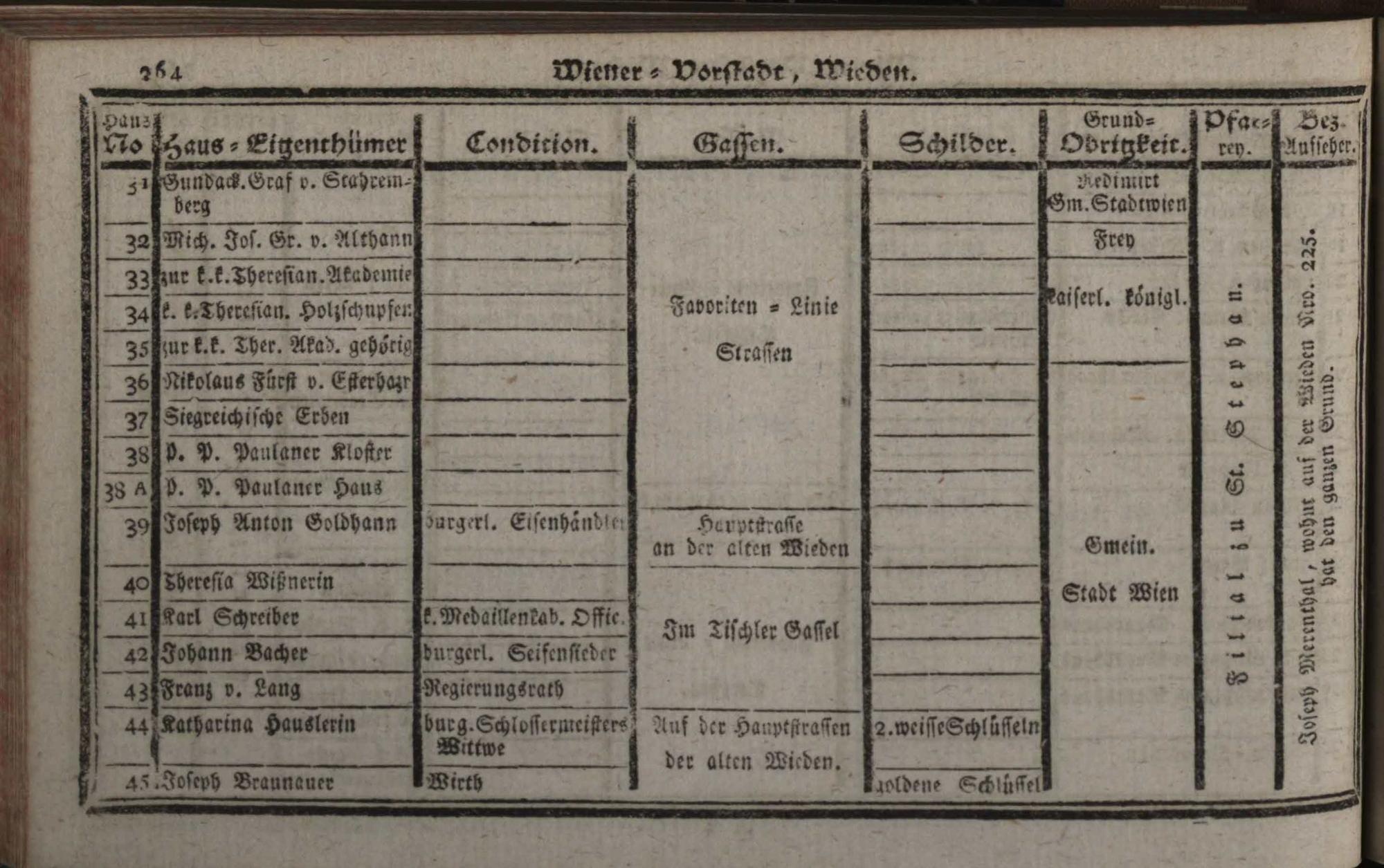 Verzeichniß der in der Kaiserl. Königl. Haupt- und Residenzstadt Wien, sammt dazu gehörigen Vorstädten, und Gründen, befindlichen numerirten Häusern derselben Eigenthümern, und deren Conditionen, Schilderen, Gassen, Grund-Obrigkeiten, Pfarreyen, und derzeit Bezirksaufsehern : auf das genaueste nach denen Grundbüchern entworfen / Von Franz de Ponty