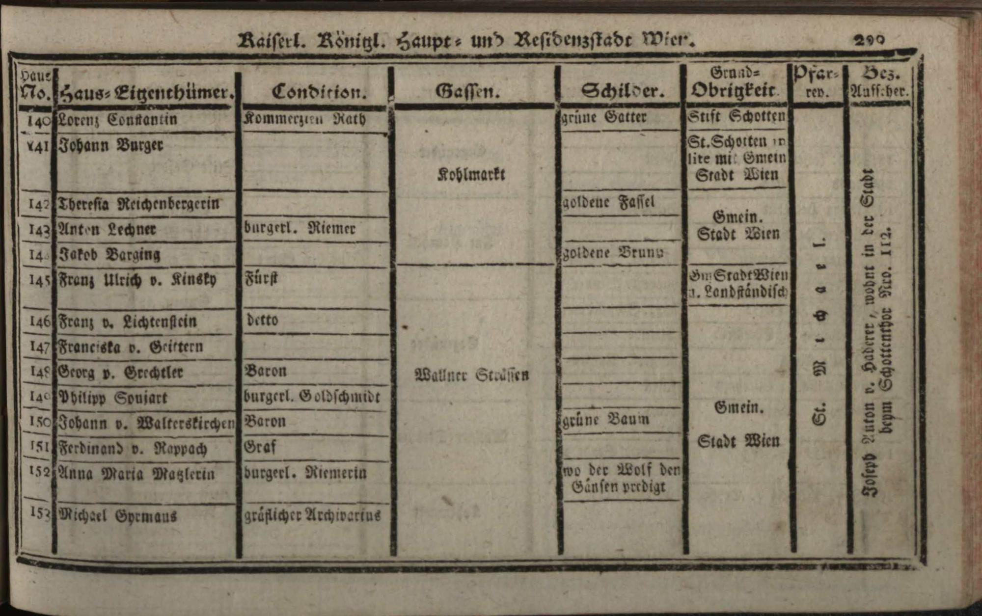 Verzeichniß der in der Kaiserl. Königl. Haupt- und Residenzstadt Wien, sammt dazu gehörigen Vorstädten, und Gründen, befindlichen numerirten Häusern derselben Eigenthümern, und deren Conditionen, Schilderen, Gassen, Grund-Obrigkeiten, Pfarreyen, und derzeit Bezirksaufsehern : auf das genaueste nach denen Grundbüchern entworfen / Von Franz de Ponty
