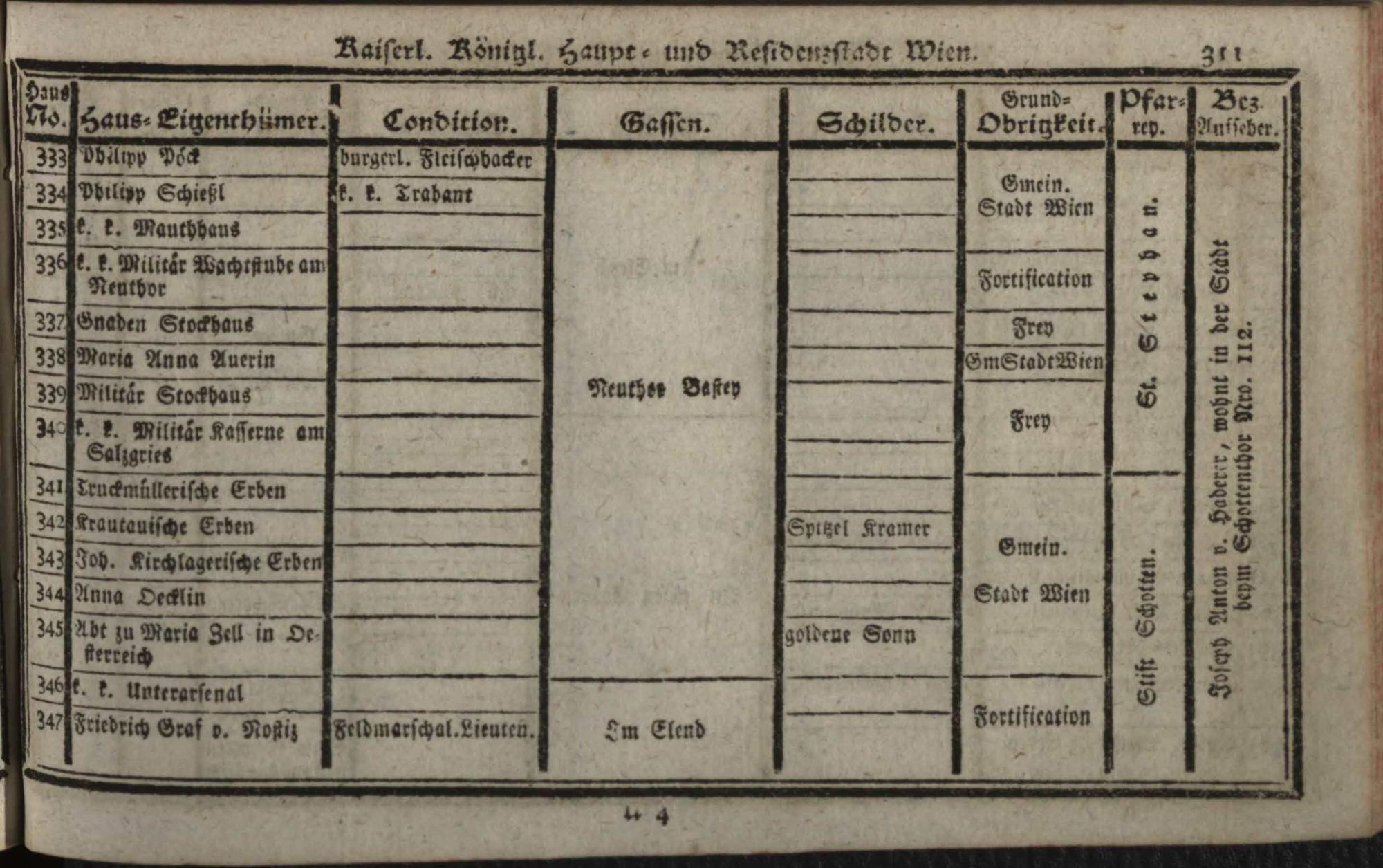 Verzeichniß der in der Kaiserl. Königl. Haupt- und Residenzstadt Wien, sammt dazu gehörigen Vorstädten, und Gründen, befindlichen numerirten Häusern derselben Eigenthümern, und deren Conditionen, Schilderen, Gassen, Grund-Obrigkeiten, Pfarreyen, und derzeit Bezirksaufsehern : auf das genaueste nach denen Grundbüchern entworfen / Von Franz de Ponty