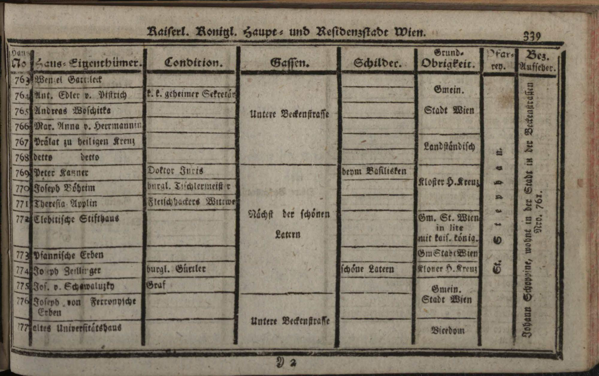 Verzeichniß der in der Kaiserl. Königl. Haupt- und Residenzstadt Wien, sammt dazu gehörigen Vorstädten, und Gründen, befindlichen numerirten Häusern derselben Eigenthümern, und deren Conditionen, Schilderen, Gassen, Grund-Obrigkeiten, Pfarreyen, und derzeit Bezirksaufsehern : auf das genaueste nach denen Grundbüchern entworfen / Von Franz de Ponty