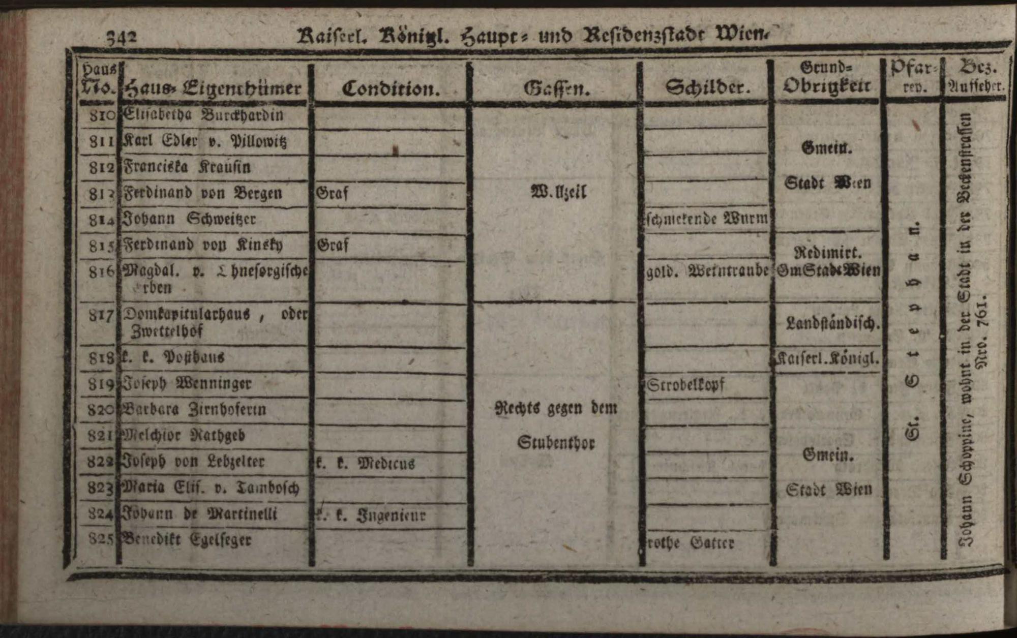 Verzeichniß der in der Kaiserl. Königl. Haupt- und Residenzstadt Wien, sammt dazu gehörigen Vorstädten, und Gründen, befindlichen numerirten Häusern derselben Eigenthümern, und deren Conditionen, Schilderen, Gassen, Grund-Obrigkeiten, Pfarreyen, und derzeit Bezirksaufsehern : auf das genaueste nach denen Grundbüchern entworfen / Von Franz de Ponty