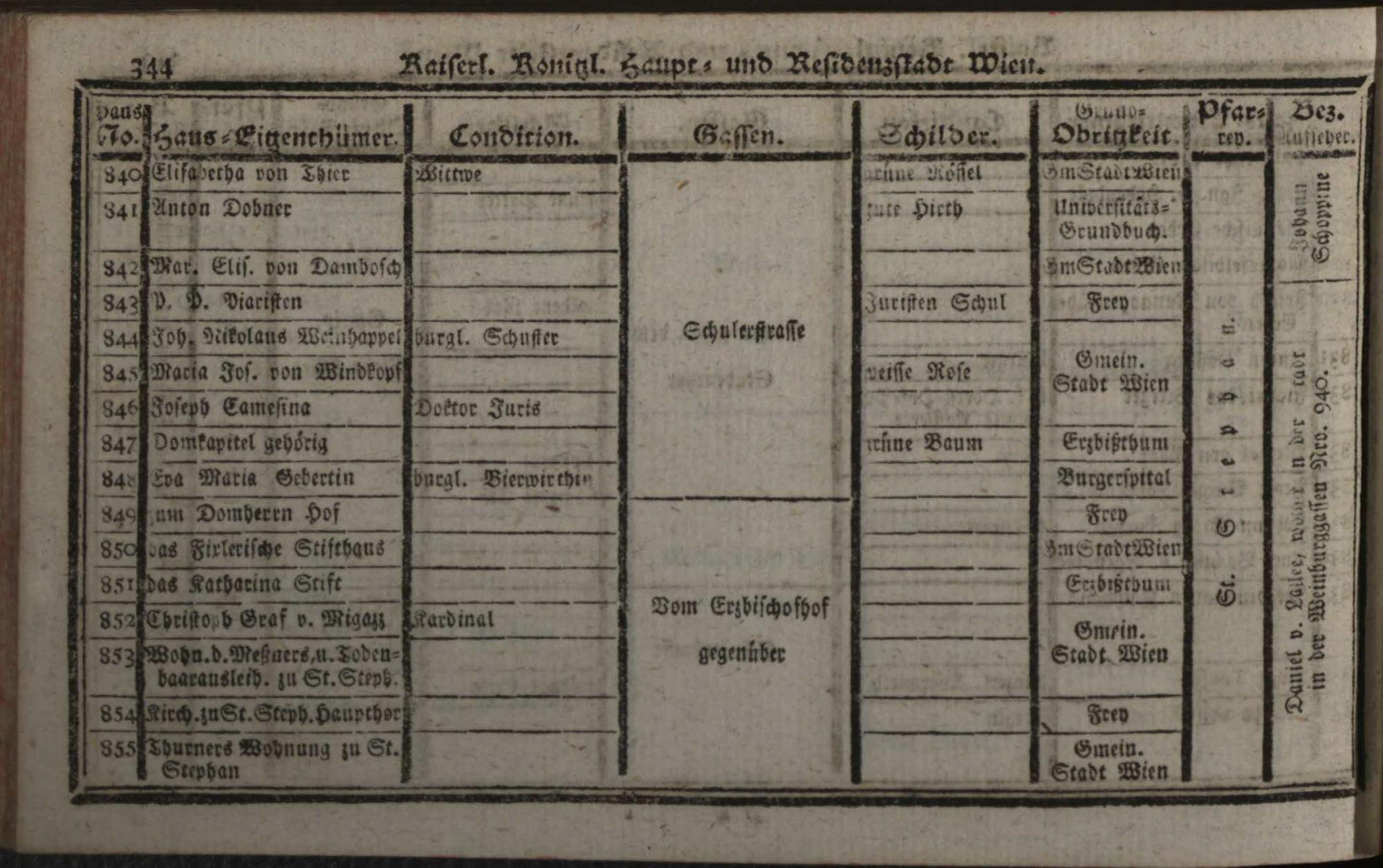 Verzeichniß der in der Kaiserl. Königl. Haupt- und Residenzstadt Wien, sammt dazu gehörigen Vorstädten, und Gründen, befindlichen numerirten Häusern derselben Eigenthümern, und deren Conditionen, Schilderen, Gassen, Grund-Obrigkeiten, Pfarreyen, und derzeit Bezirksaufsehern : auf das genaueste nach denen Grundbüchern entworfen / Von Franz de Ponty
