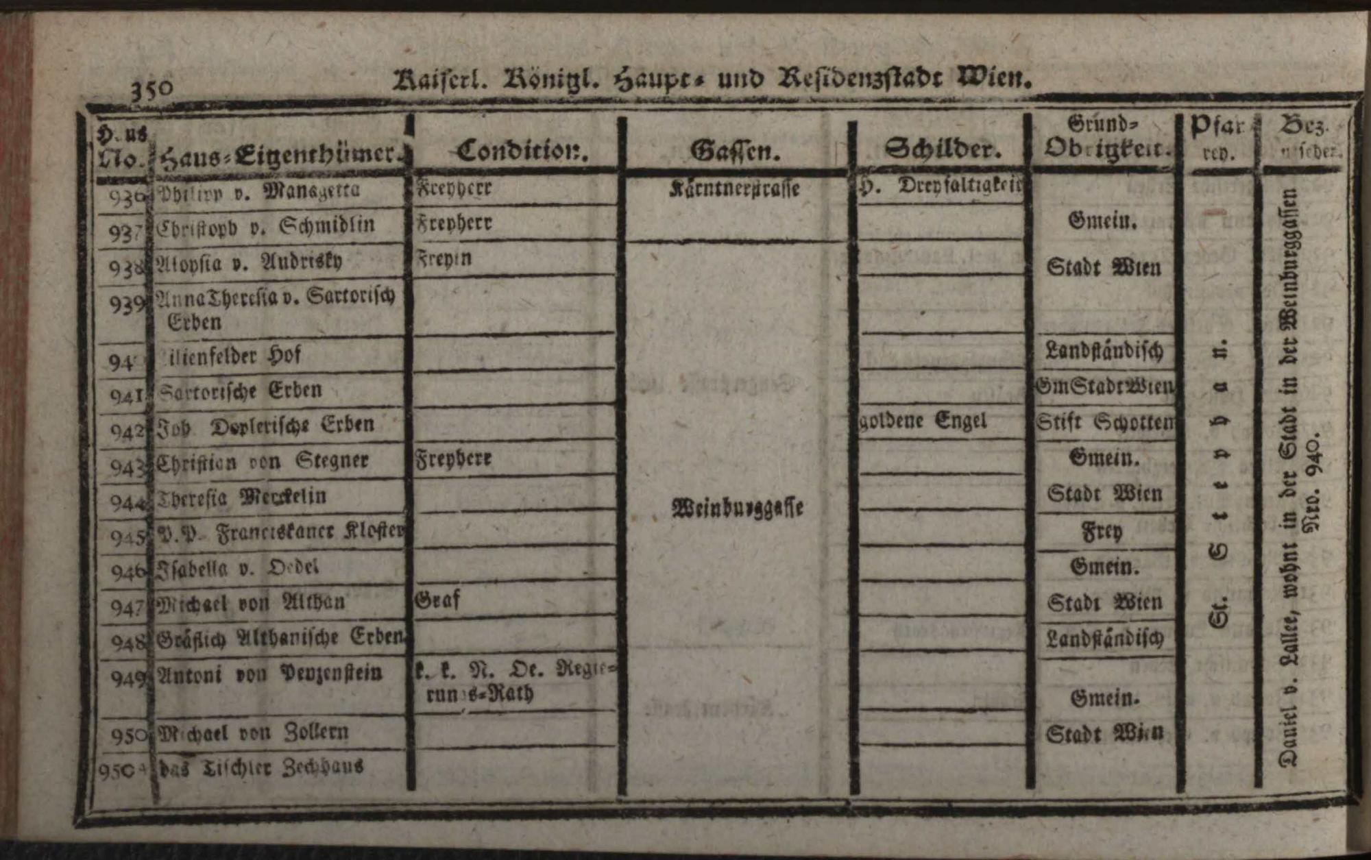 Verzeichniß der in der Kaiserl. Königl. Haupt- und Residenzstadt Wien, sammt dazu gehörigen Vorstädten, und Gründen, befindlichen numerirten Häusern derselben Eigenthümern, und deren Conditionen, Schilderen, Gassen, Grund-Obrigkeiten, Pfarreyen, und derzeit Bezirksaufsehern : auf das genaueste nach denen Grundbüchern entworfen / Von Franz de Ponty