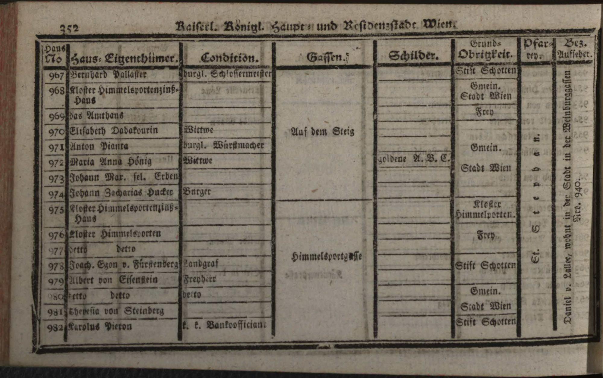 Verzeichniß der in der Kaiserl. Königl. Haupt- und Residenzstadt Wien, sammt dazu gehörigen Vorstädten, und Gründen, befindlichen numerirten Häusern derselben Eigenthümern, und deren Conditionen, Schilderen, Gassen, Grund-Obrigkeiten, Pfarreyen, und derzeit Bezirksaufsehern : auf das genaueste nach denen Grundbüchern entworfen / Von Franz de Ponty