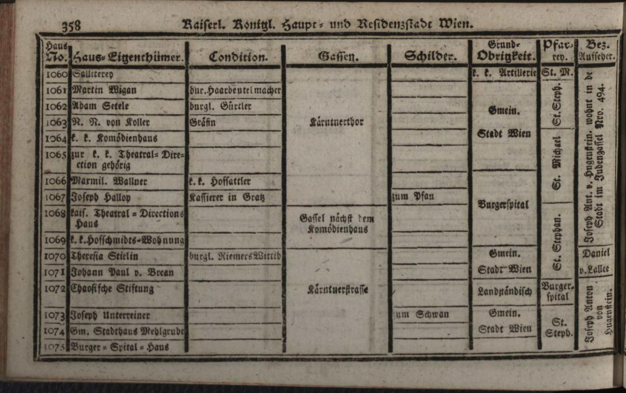 Verzeichniß der in der Kaiserl. Königl. Haupt- und Residenzstadt Wien, sammt dazu gehörigen Vorstädten, und Gründen, befindlichen numerirten Häusern derselben Eigenthümern, und deren Conditionen, Schilderen, Gassen, Grund-Obrigkeiten, Pfarreyen, und derzeit Bezirksaufsehern : auf das genaueste nach denen Grundbüchern entworfen / Von Franz de Ponty