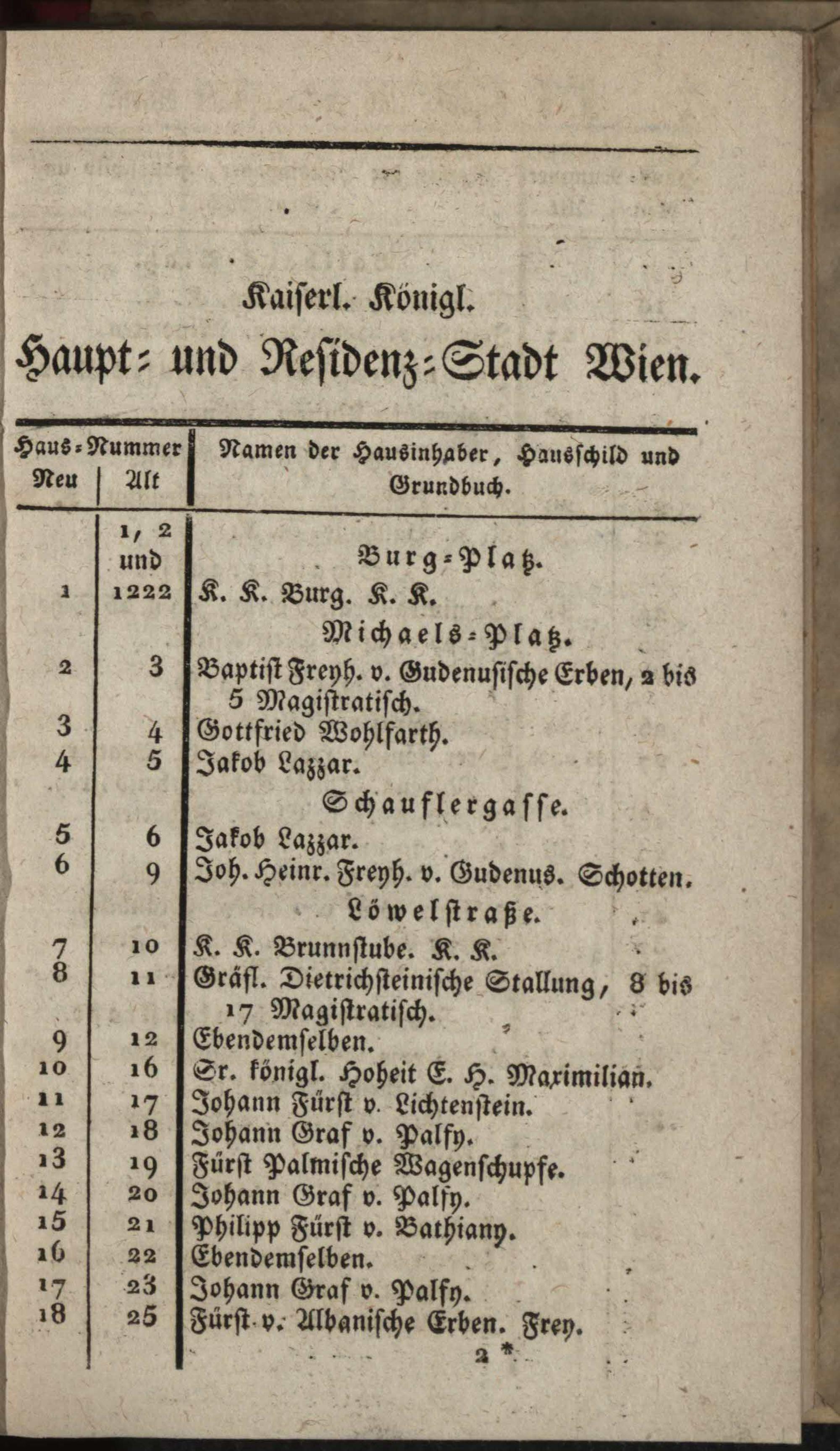 Vollständiges Verzeichniß aller in der k. k. Haupt- und Residenzstadt Wien und ihren Vorstädten befindlichen Straßen, Gassen, Plätze und Häuser, dann derselben Schilde und Eigenthümer / hrsg. von Mathias Guetjahr