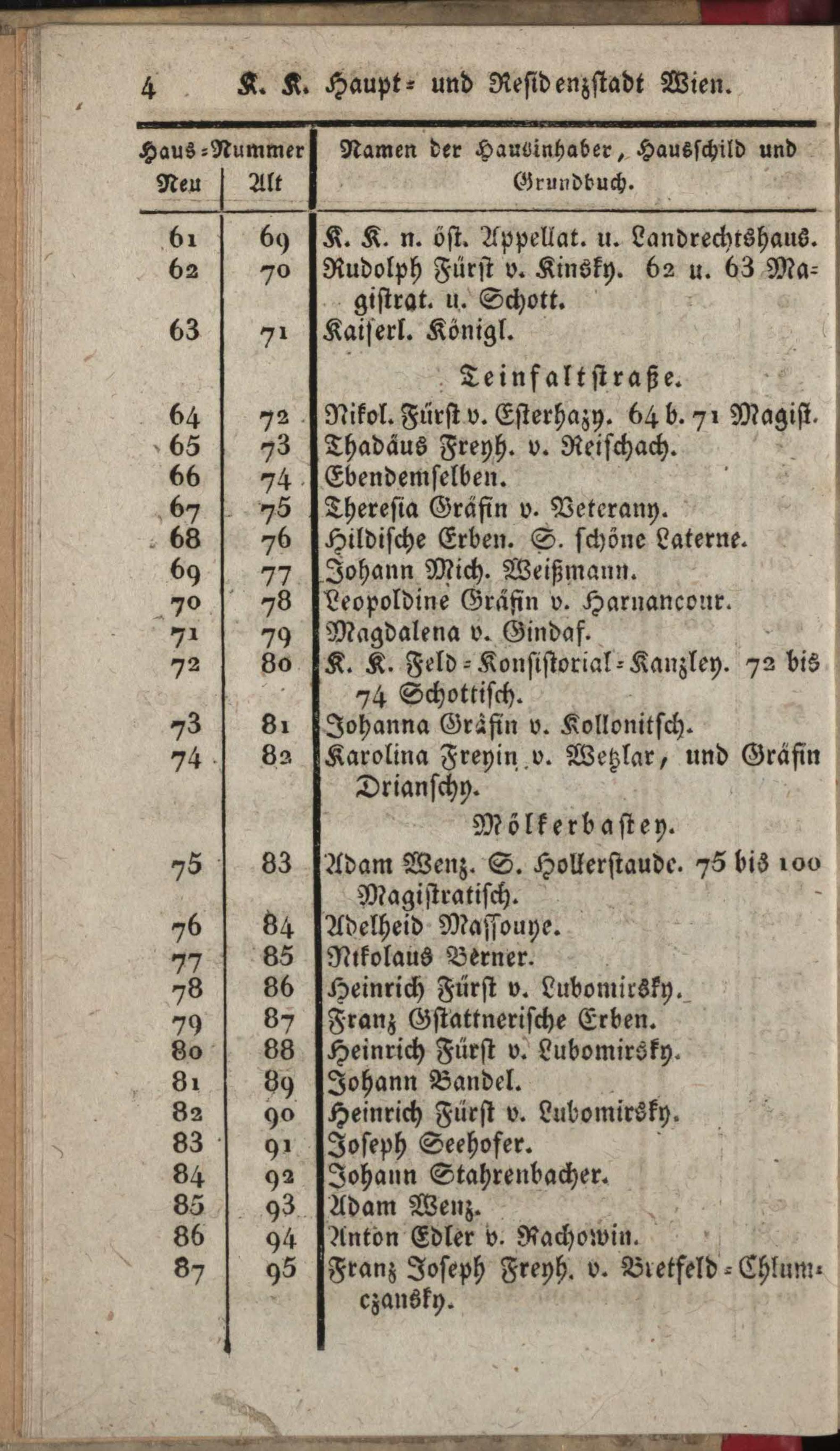 Vollständiges Verzeichniß aller in der k. k. Haupt- und Residenzstadt Wien und ihren Vorstädten befindlichen Straßen, Gassen, Plätze und Häuser, dann derselben Schilde und Eigenthümer / hrsg. von Mathias Guetjahr