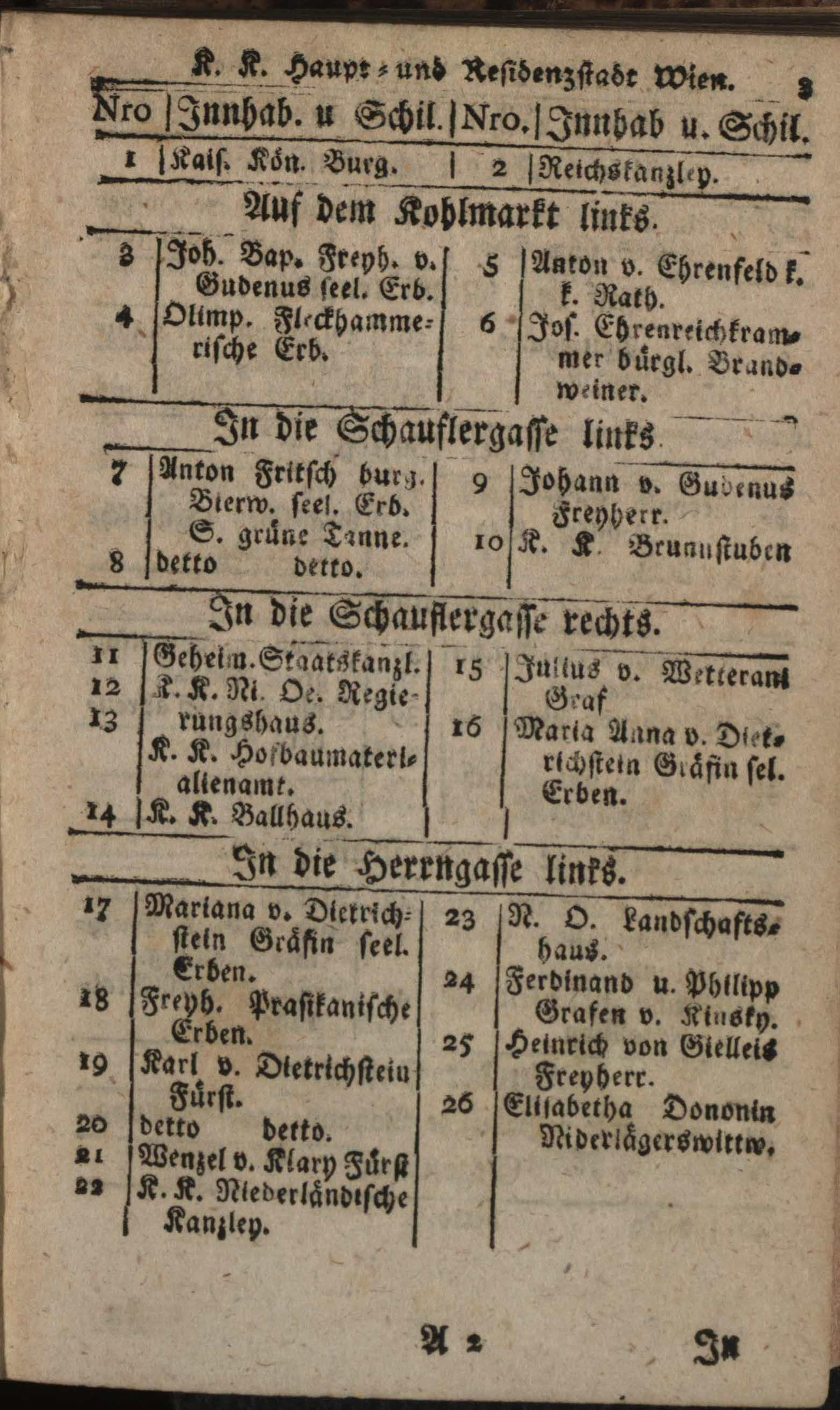 Verzeichniß der in der Kaiserl. Königl. Haupt- und Residenzstadt Wien, sammt dazu gehörigen Vorstädten und Gründen, befindlichen numerirten Häusern, derselben wahrhafte Eigenthümer, und deren Konditionen, nebst Schildern und Plätzen : Auf das genaueste nach denen Grund- und Konscriptions-Büchern entworfen / von Joseph Maximilian Fischer