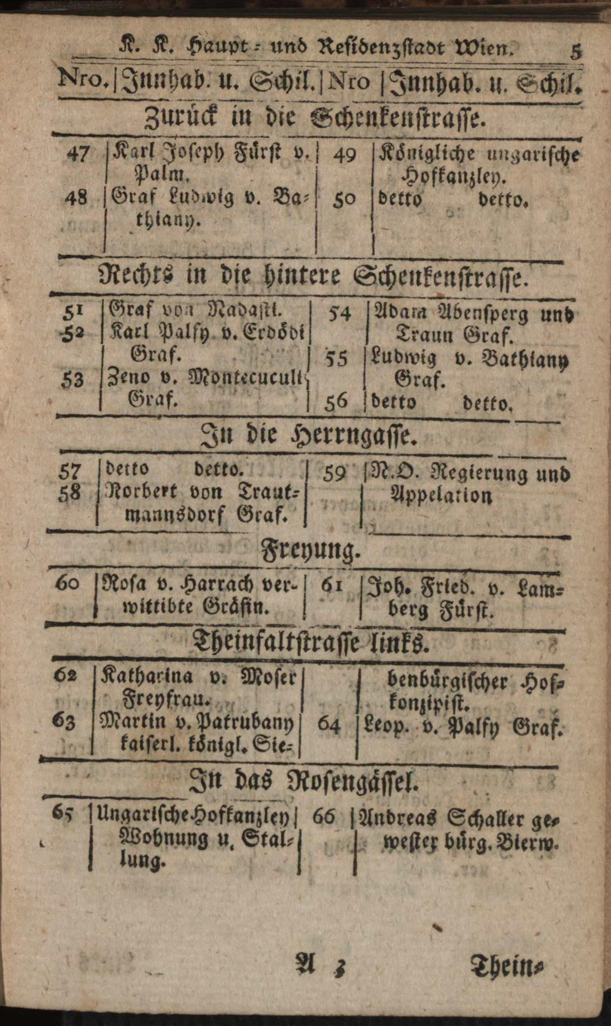 Verzeichniß der in der Kaiserl. Königl. Haupt- und Residenzstadt Wien, sammt dazu gehörigen Vorstädten und Gründen, befindlichen numerirten Häusern, derselben wahrhafte Eigenthümer, und deren Konditionen, nebst Schildern und Plätzen : Auf das genaueste nach denen Grund- und Konscriptions-Büchern entworfen / von Joseph Maximilian Fischer