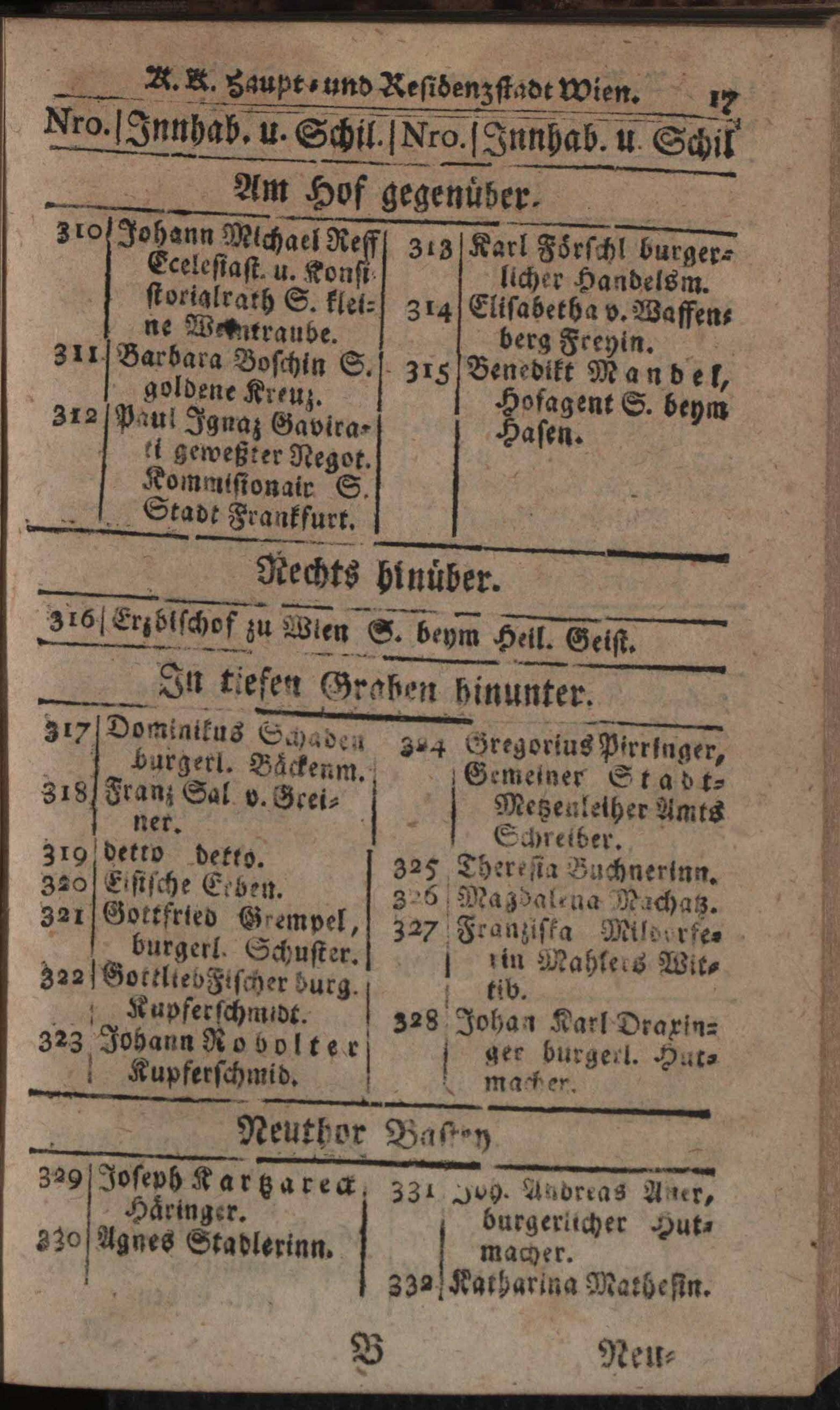 Verzeichniß der in der Kaiserl. Königl. Haupt- und Residenzstadt Wien, sammt dazu gehörigen Vorstädten und Gründen, befindlichen numerirten Häusern, derselben wahrhafte Eigenthümer, und deren Konditionen, nebst Schildern und Plätzen : Auf das genaueste nach denen Grund- und Konscriptions-Büchern entworfen / von Joseph Maximilian Fischer