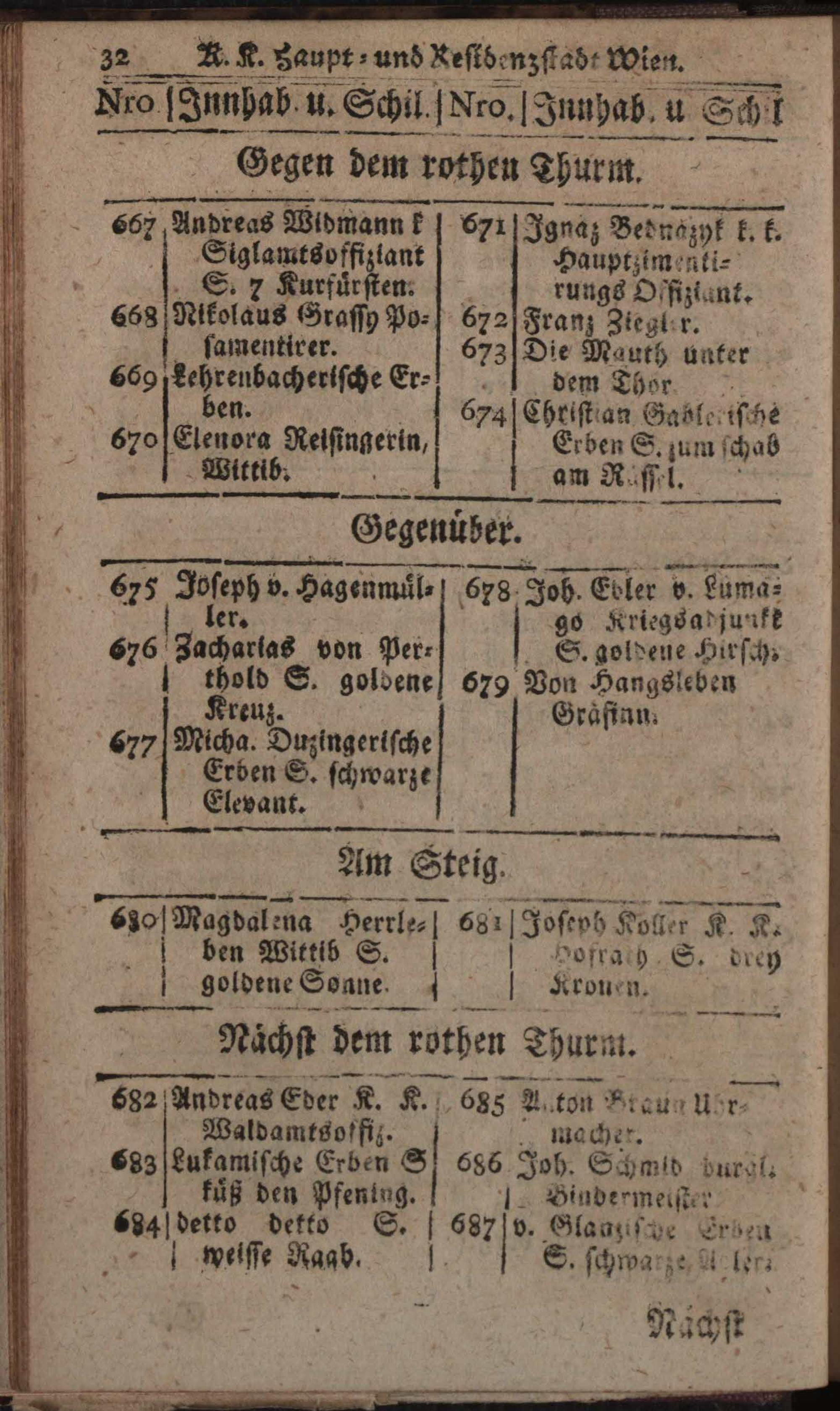 Verzeichniß der in der Kaiserl. Königl. Haupt- und Residenzstadt Wien, sammt dazu gehörigen Vorstädten und Gründen, befindlichen numerirten Häusern, derselben wahrhafte Eigenthümer, und deren Konditionen, nebst Schildern und Plätzen : Auf das genaueste nach denen Grund- und Konscriptions-Büchern entworfen / von Joseph Maximilian Fischer