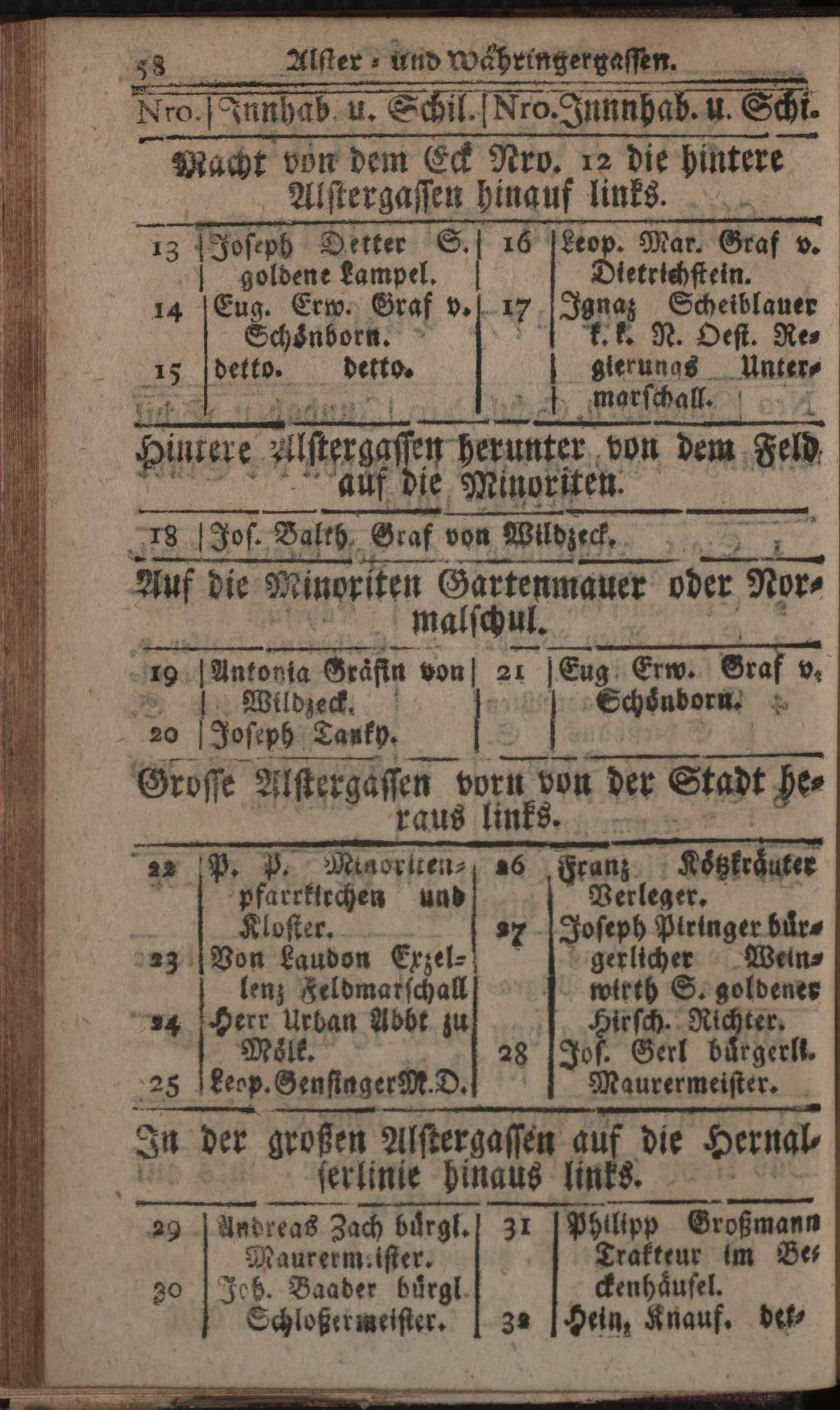 Verzeichniß der in der Kaiserl. Königl. Haupt- und Residenzstadt Wien, sammt dazu gehörigen Vorstädten und Gründen, befindlichen numerirten Häusern, derselben wahrhafte Eigenthümer, und deren Konditionen, nebst Schildern und Plätzen : Auf das genaueste nach denen Grund- und Konscriptions-Büchern entworfen / von Joseph Maximilian Fischer