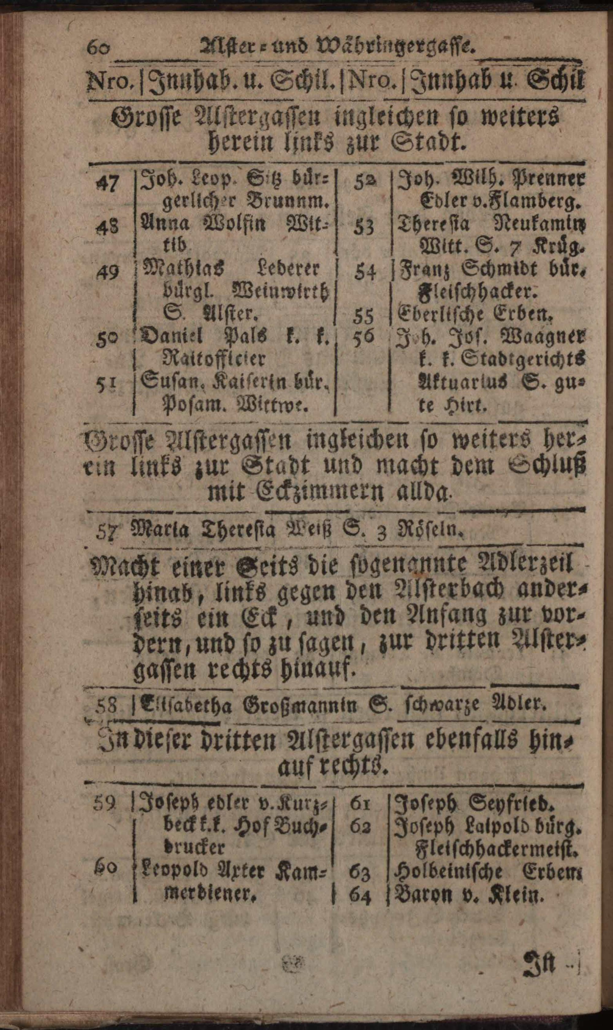Verzeichniß der in der Kaiserl. Königl. Haupt- und Residenzstadt Wien, sammt dazu gehörigen Vorstädten und Gründen, befindlichen numerirten Häusern, derselben wahrhafte Eigenthümer, und deren Konditionen, nebst Schildern und Plätzen : Auf das genaueste nach denen Grund- und Konscriptions-Büchern entworfen / von Joseph Maximilian Fischer