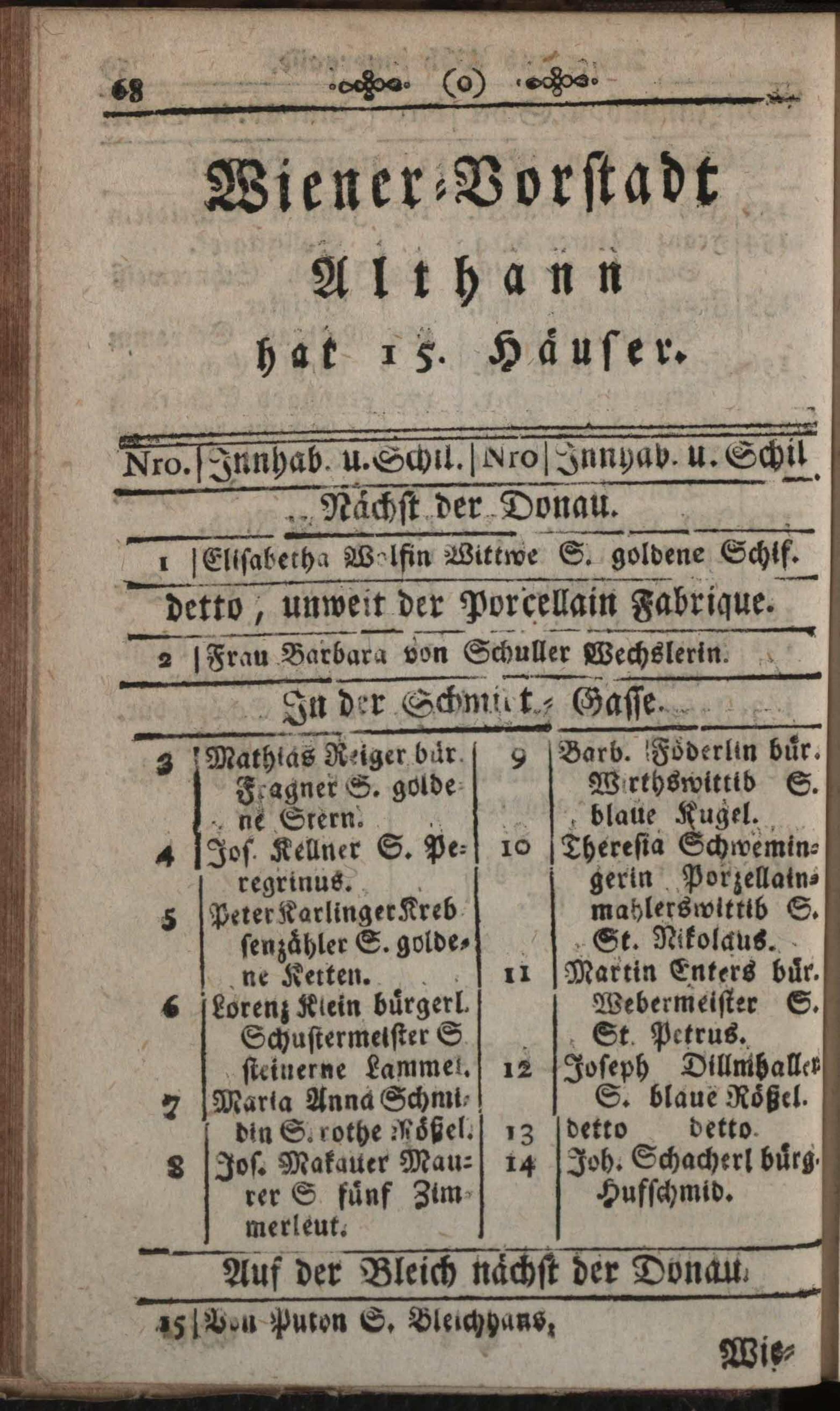 Verzeichniß der in der Kaiserl. Königl. Haupt- und Residenzstadt Wien, sammt dazu gehörigen Vorstädten und Gründen, befindlichen numerirten Häusern, derselben wahrhafte Eigenthümer, und deren Konditionen, nebst Schildern und Plätzen : Auf das genaueste nach denen Grund- und Konscriptions-Büchern entworfen / von Joseph Maximilian Fischer