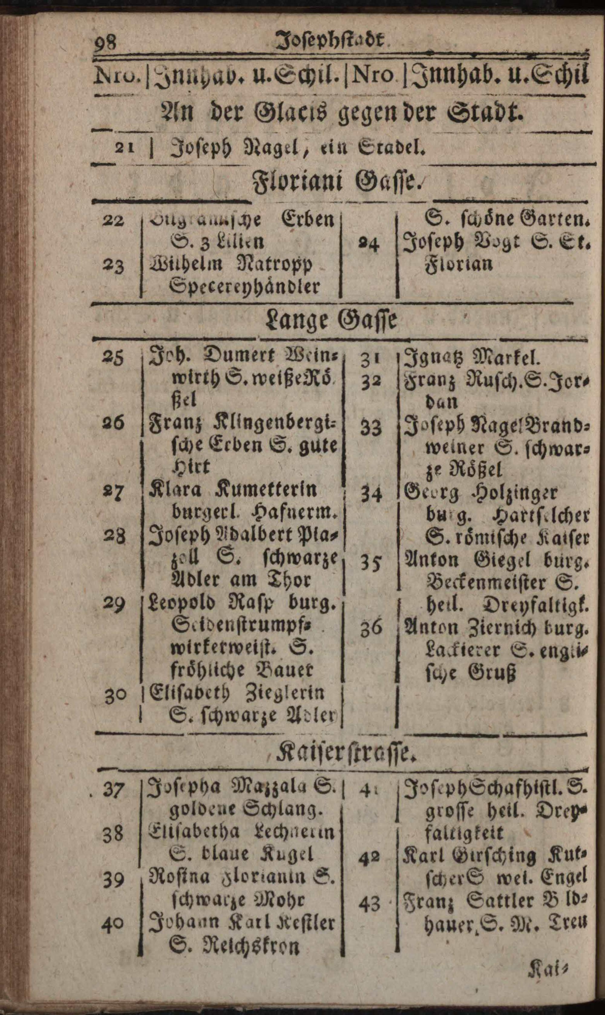 Verzeichniß der in der Kaiserl. Königl. Haupt- und Residenzstadt Wien, sammt dazu gehörigen Vorstädten und Gründen, befindlichen numerirten Häusern, derselben wahrhafte Eigenthümer, und deren Konditionen, nebst Schildern und Plätzen : Auf das genaueste nach denen Grund- und Konscriptions-Büchern entworfen / von Joseph Maximilian Fischer