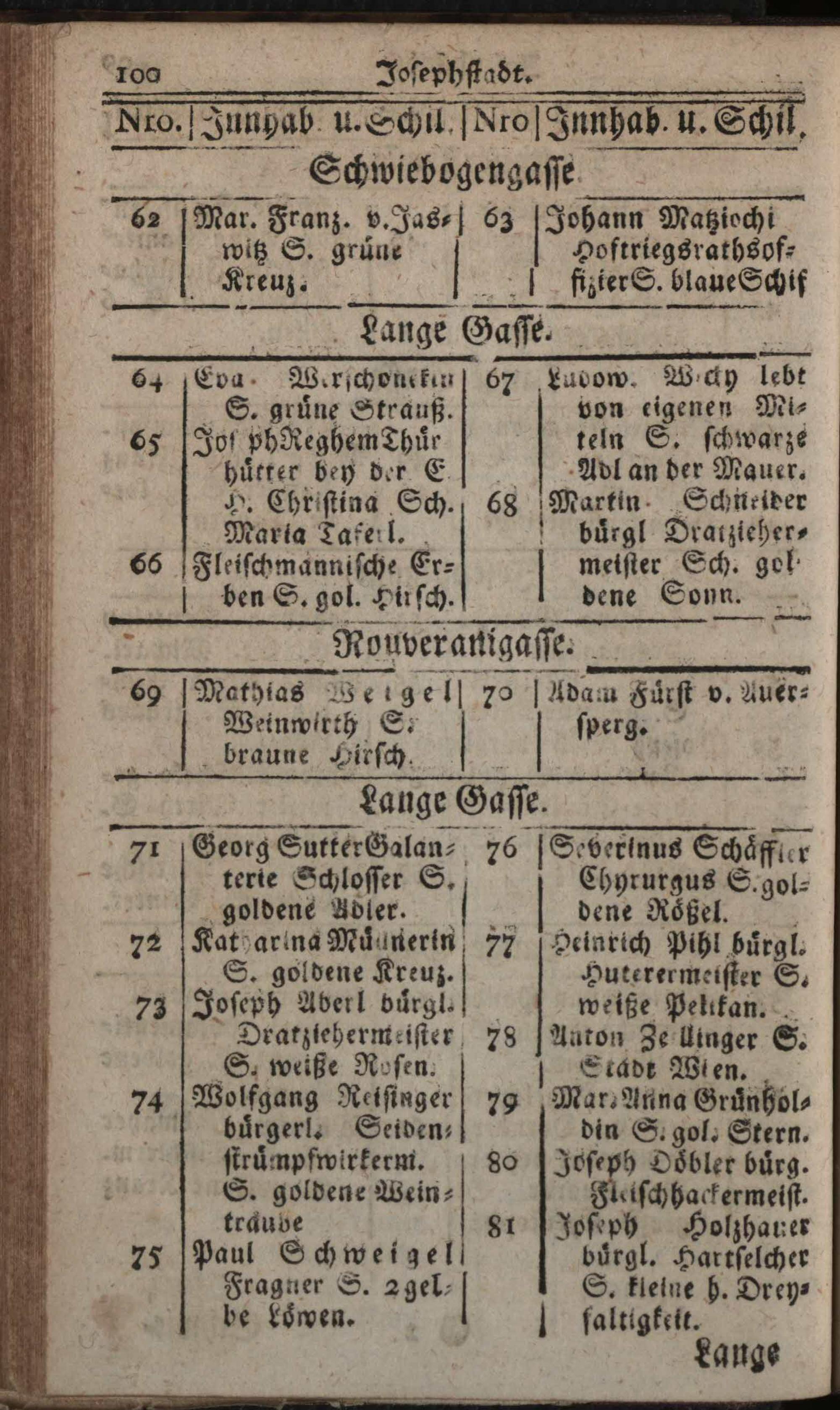 Verzeichniß der in der Kaiserl. Königl. Haupt- und Residenzstadt Wien, sammt dazu gehörigen Vorstädten und Gründen, befindlichen numerirten Häusern, derselben wahrhafte Eigenthümer, und deren Konditionen, nebst Schildern und Plätzen : Auf das genaueste nach denen Grund- und Konscriptions-Büchern entworfen / von Joseph Maximilian Fischer