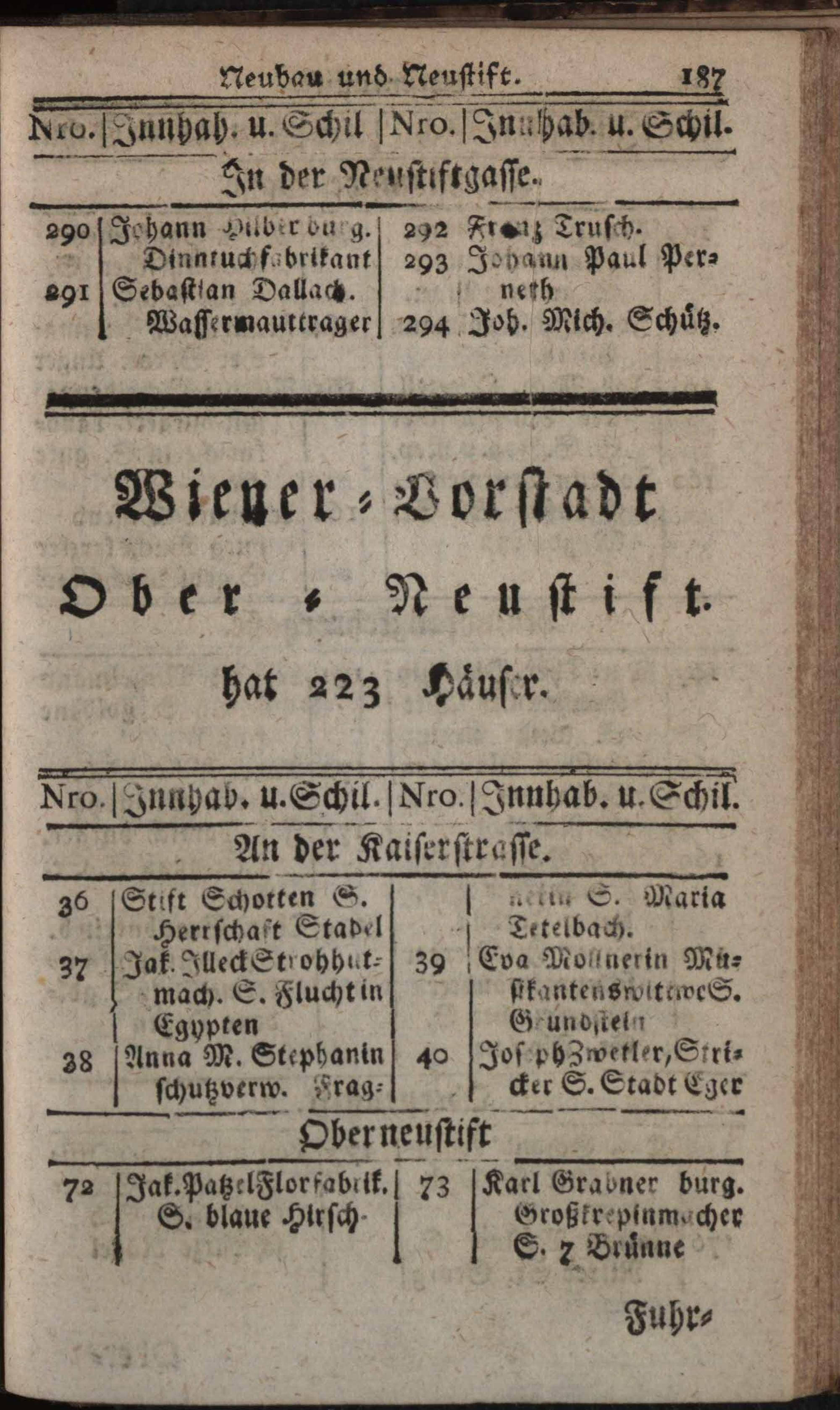 Verzeichniß der in der Kaiserl. Königl. Haupt- und Residenzstadt Wien, sammt dazu gehörigen Vorstädten und Gründen, befindlichen numerirten Häusern, derselben wahrhafte Eigenthümer, und deren Konditionen, nebst Schildern und Plätzen : Auf das genaueste nach denen Grund- und Konscriptions-Büchern entworfen / von Joseph Maximilian Fischer