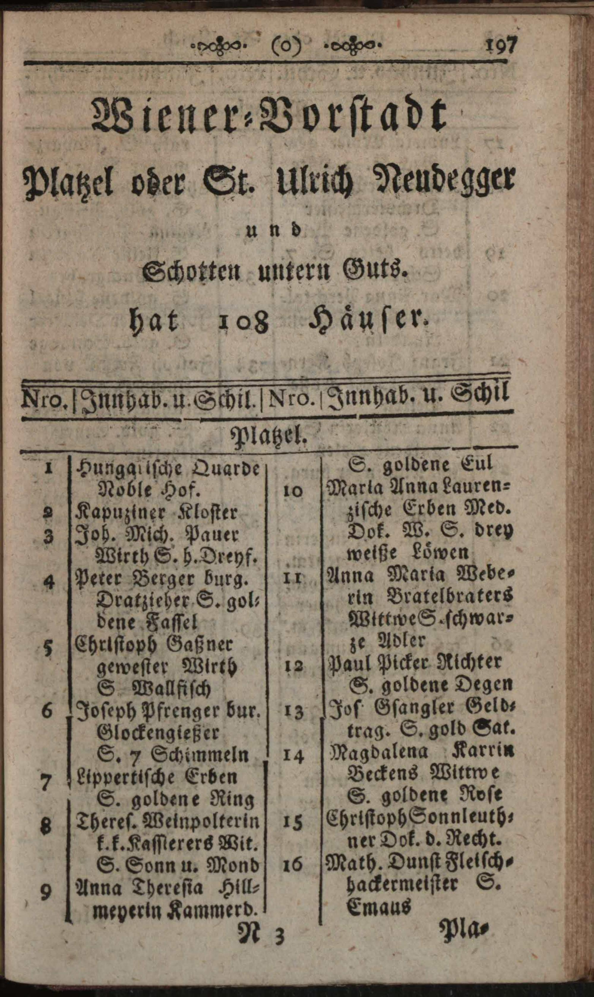Verzeichniß der in der Kaiserl. Königl. Haupt- und Residenzstadt Wien, sammt dazu gehörigen Vorstädten und Gründen, befindlichen numerirten Häusern, derselben wahrhafte Eigenthümer, und deren Konditionen, nebst Schildern und Plätzen : Auf das genaueste nach denen Grund- und Konscriptions-Büchern entworfen / von Joseph Maximilian Fischer