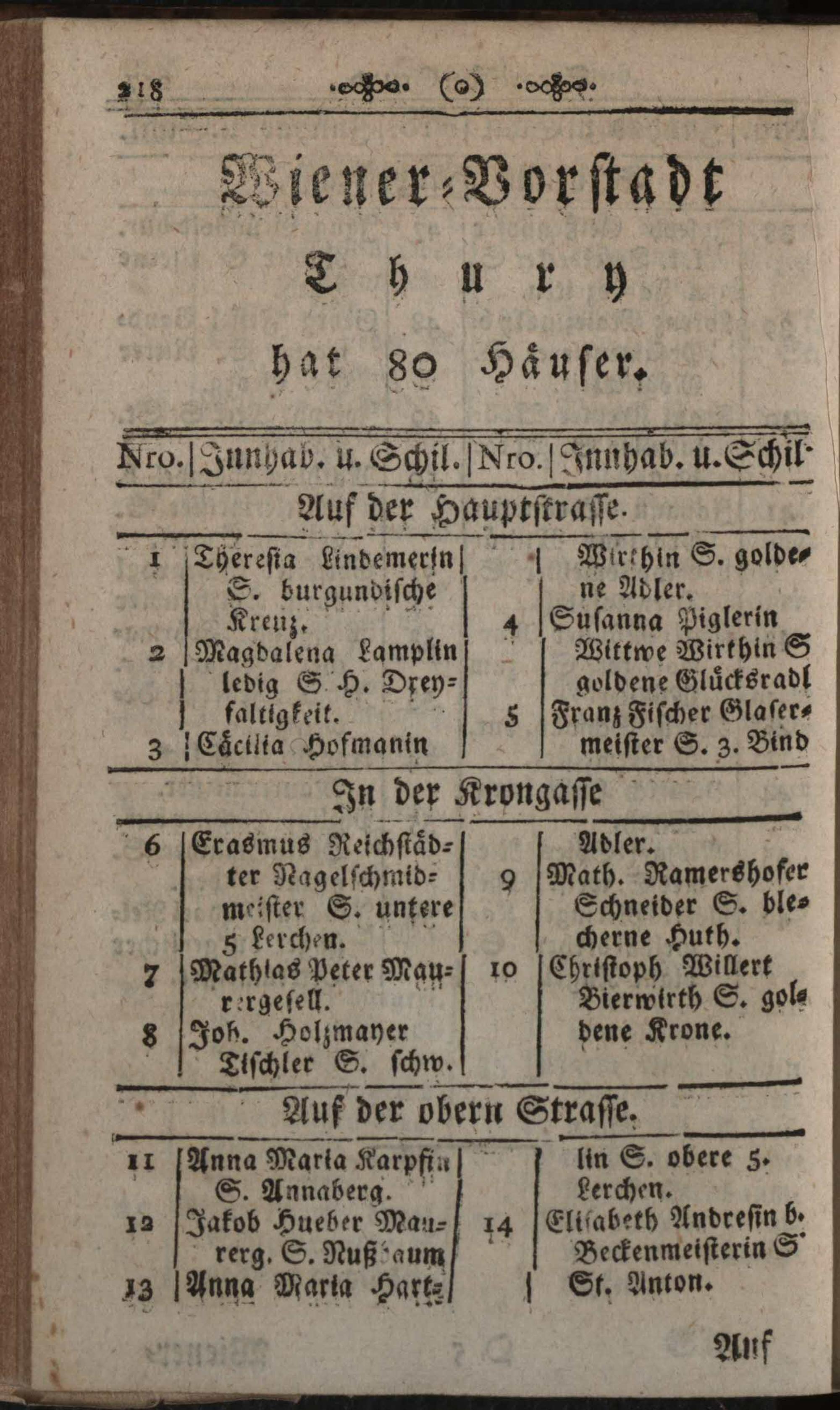 Verzeichniß der in der Kaiserl. Königl. Haupt- und Residenzstadt Wien, sammt dazu gehörigen Vorstädten und Gründen, befindlichen numerirten Häusern, derselben wahrhafte Eigenthümer, und deren Konditionen, nebst Schildern und Plätzen : Auf das genaueste nach denen Grund- und Konscriptions-Büchern entworfen / von Joseph Maximilian Fischer