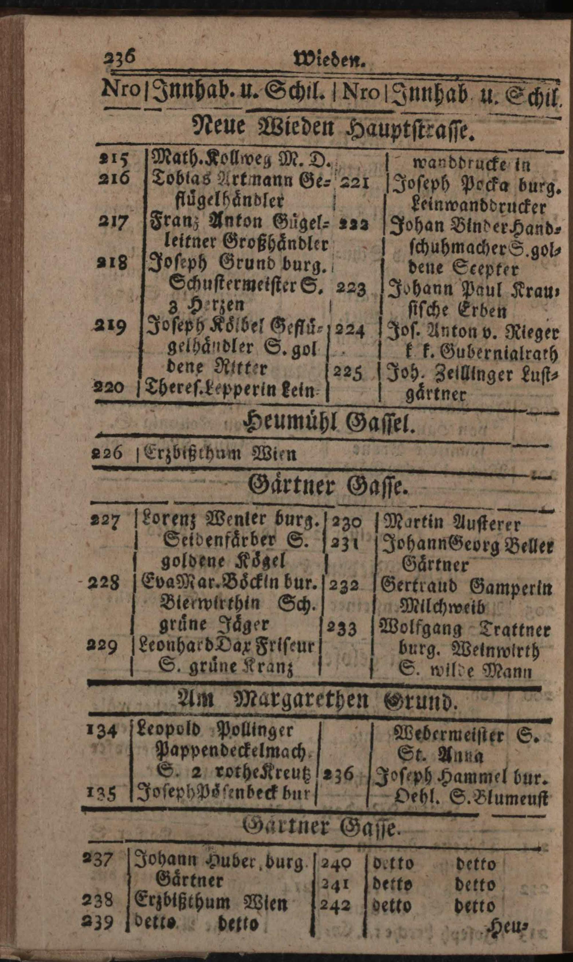 Verzeichniß der in der Kaiserl. Königl. Haupt- und Residenzstadt Wien, sammt dazu gehörigen Vorstädten und Gründen, befindlichen numerirten Häusern, derselben wahrhafte Eigenthümer, und deren Konditionen, nebst Schildern und Plätzen : Auf das genaueste nach denen Grund- und Konscriptions-Büchern entworfen / von Joseph Maximilian Fischer