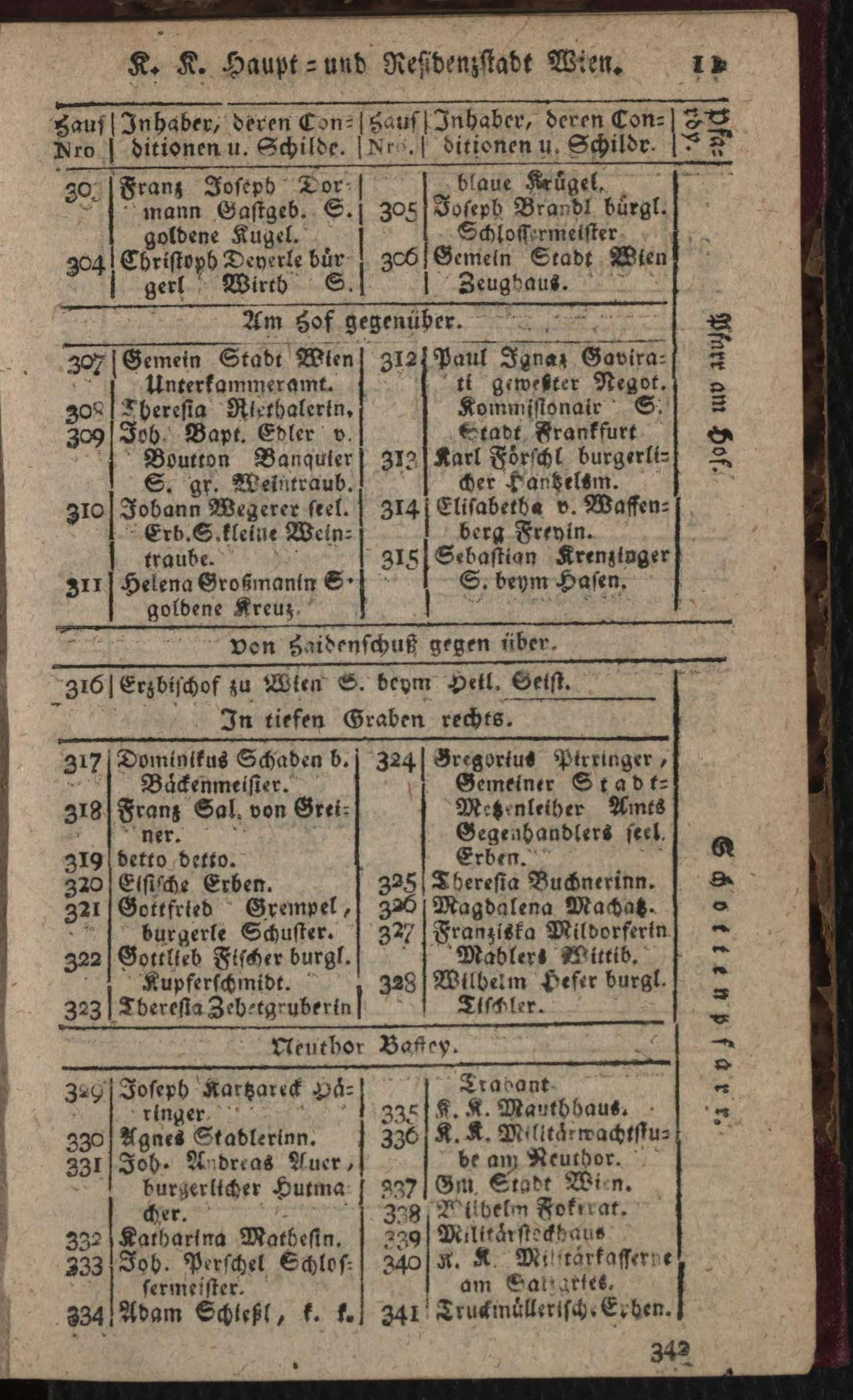 Verzeichniß der in der k. k. Haupt- und Residenzstadt Wien samt den dazu gehörigen Vorstädten und Gründen befindlichen numerirten Häuser, derselben wahrhaften Eigenthümer, deren Konditionen und Schilder : nebst der nach allerhöchster k. k. Verordnung ergangenen neuen Pfarreintheilung ; Auf das genaueste nach den Konskriptions- und herrschaftlichen Grundbüchern von neuem entworfen / von Karl Hofer