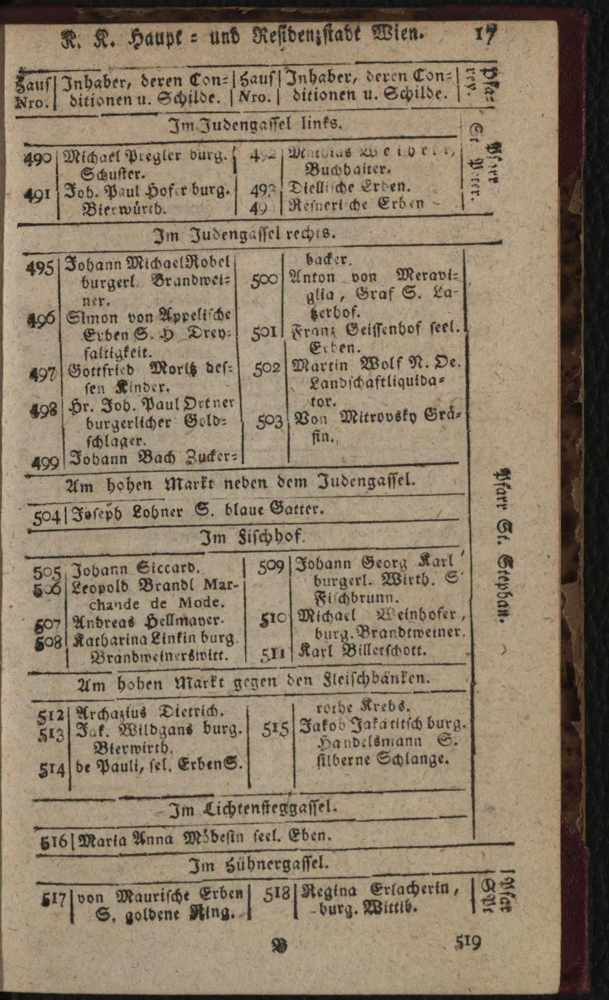 Verzeichniß der in der k. k. Haupt- und Residenzstadt Wien samt den dazu gehörigen Vorstädten und Gründen befindlichen numerirten Häuser, derselben wahrhaften Eigenthümer, deren Konditionen und Schilder : nebst der nach allerhöchster k. k. Verordnung ergangenen neuen Pfarreintheilung ; Auf das genaueste nach den Konskriptions- und herrschaftlichen Grundbüchern von neuem entworfen / von Karl Hofer