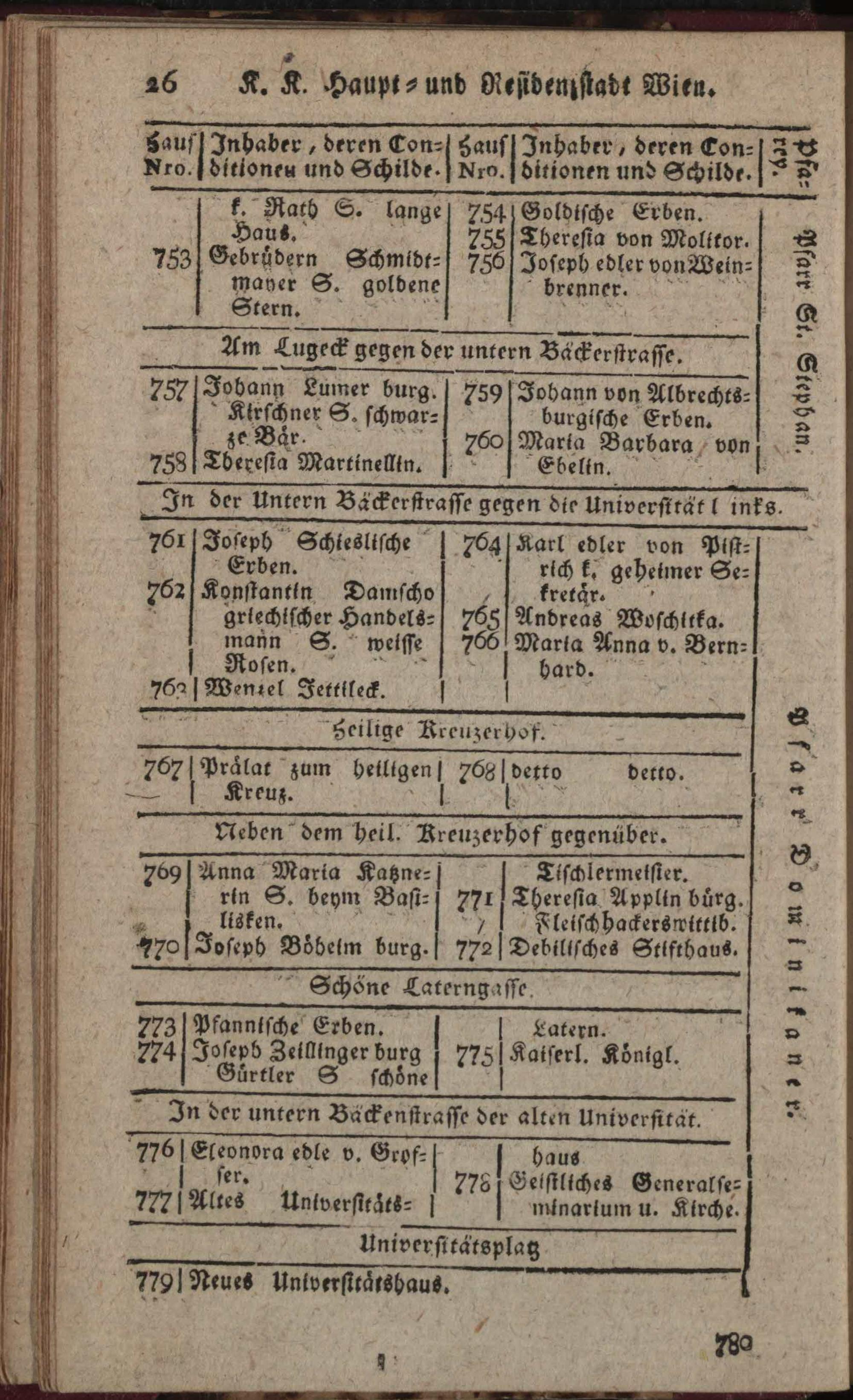 Verzeichniß der in der k. k. Haupt- und Residenzstadt Wien samt den dazu gehörigen Vorstädten und Gründen befindlichen numerirten Häuser, derselben wahrhaften Eigenthümer, deren Konditionen und Schilder : nebst der nach allerhöchster k. k. Verordnung ergangenen neuen Pfarreintheilung ; Auf das genaueste nach den Konskriptions- und herrschaftlichen Grundbüchern von neuem entworfen / von Karl Hofer