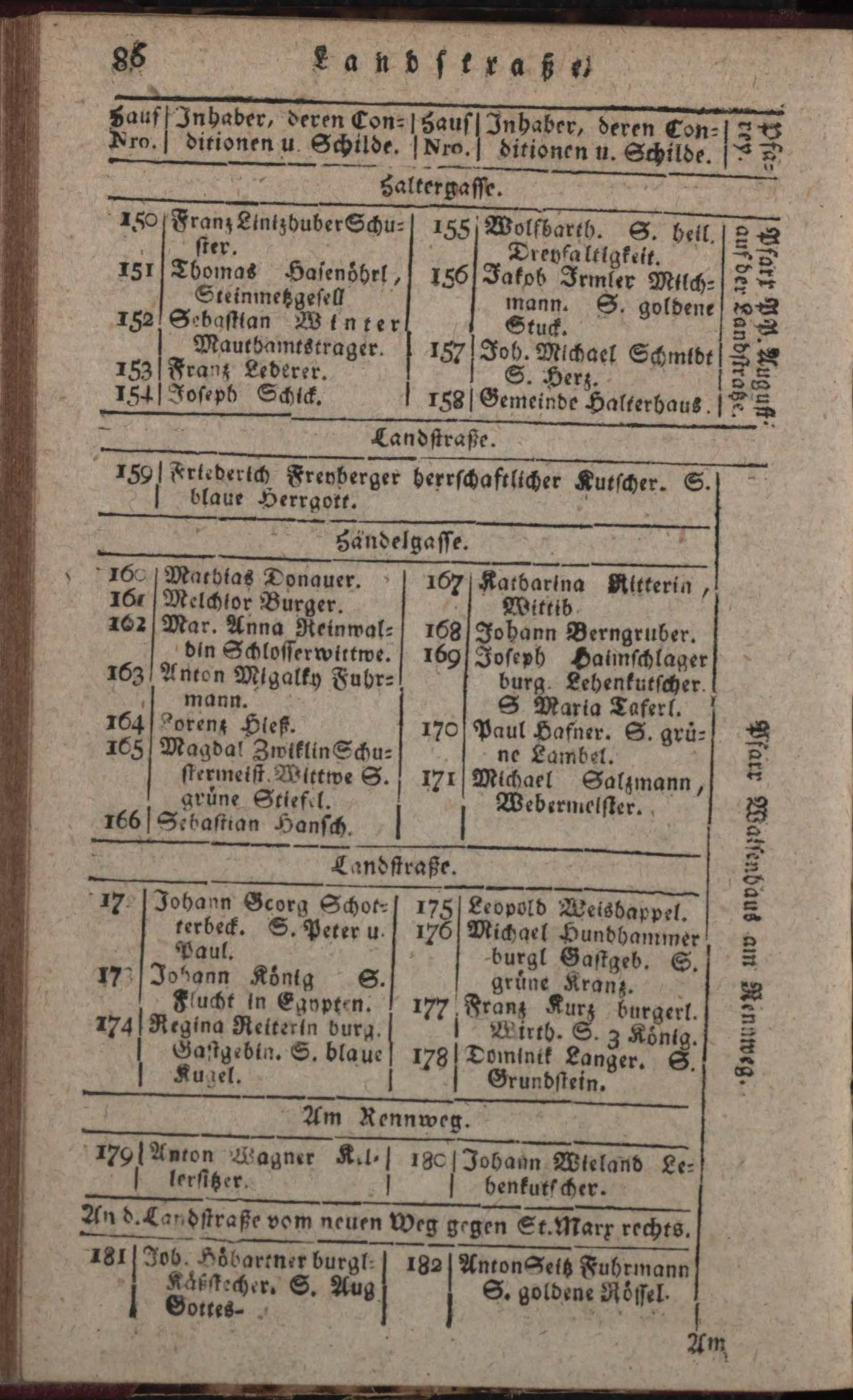 Verzeichniß der in der k. k. Haupt- und Residenzstadt Wien samt den dazu gehörigen Vorstädten und Gründen befindlichen numerirten Häuser, derselben wahrhaften Eigenthümer, deren Konditionen und Schilder : nebst der nach allerhöchster k. k. Verordnung ergangenen neuen Pfarreintheilung ; Auf das genaueste nach den Konskriptions- und herrschaftlichen Grundbüchern von neuem entworfen / von Karl Hofer