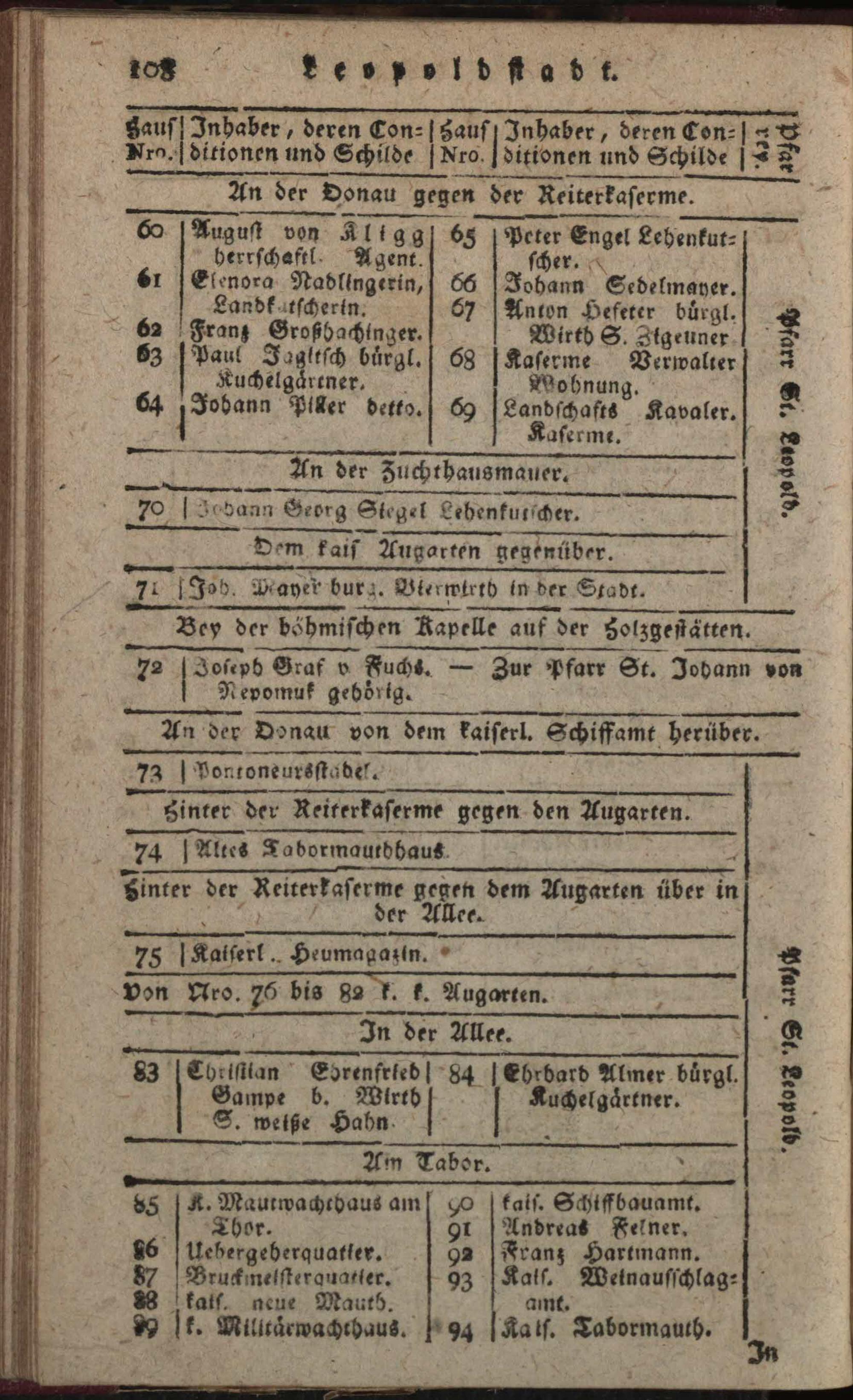 Verzeichniß der in der k. k. Haupt- und Residenzstadt Wien samt den dazu gehörigen Vorstädten und Gründen befindlichen numerirten Häuser, derselben wahrhaften Eigenthümer, deren Konditionen und Schilder : nebst der nach allerhöchster k. k. Verordnung ergangenen neuen Pfarreintheilung ; Auf das genaueste nach den Konskriptions- und herrschaftlichen Grundbüchern von neuem entworfen / von Karl Hofer