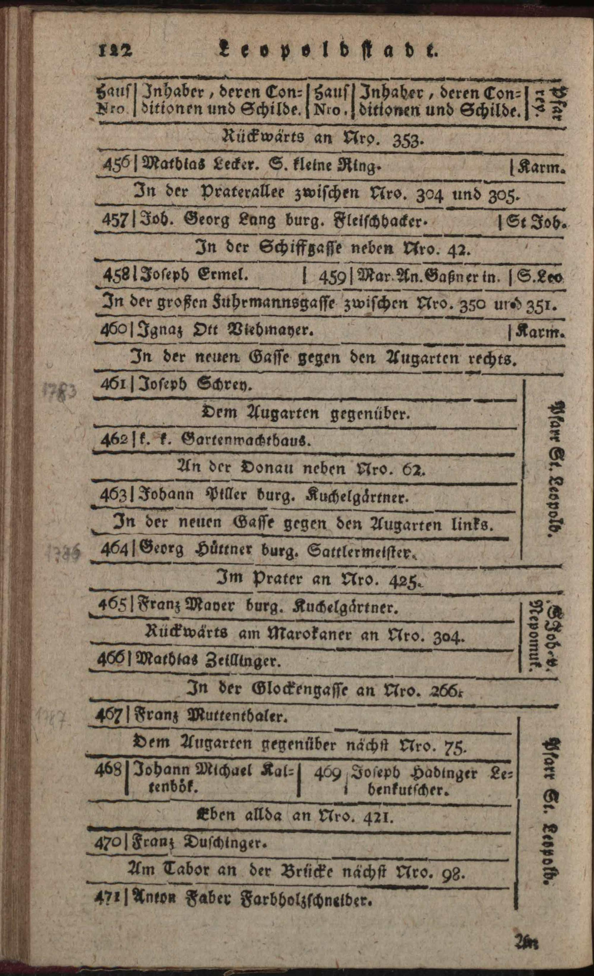 Verzeichniß der in der k. k. Haupt- und Residenzstadt Wien samt den dazu gehörigen Vorstädten und Gründen befindlichen numerirten Häuser, derselben wahrhaften Eigenthümer, deren Konditionen und Schilder : nebst der nach allerhöchster k. k. Verordnung ergangenen neuen Pfarreintheilung ; Auf das genaueste nach den Konskriptions- und herrschaftlichen Grundbüchern von neuem entworfen / von Karl Hofer