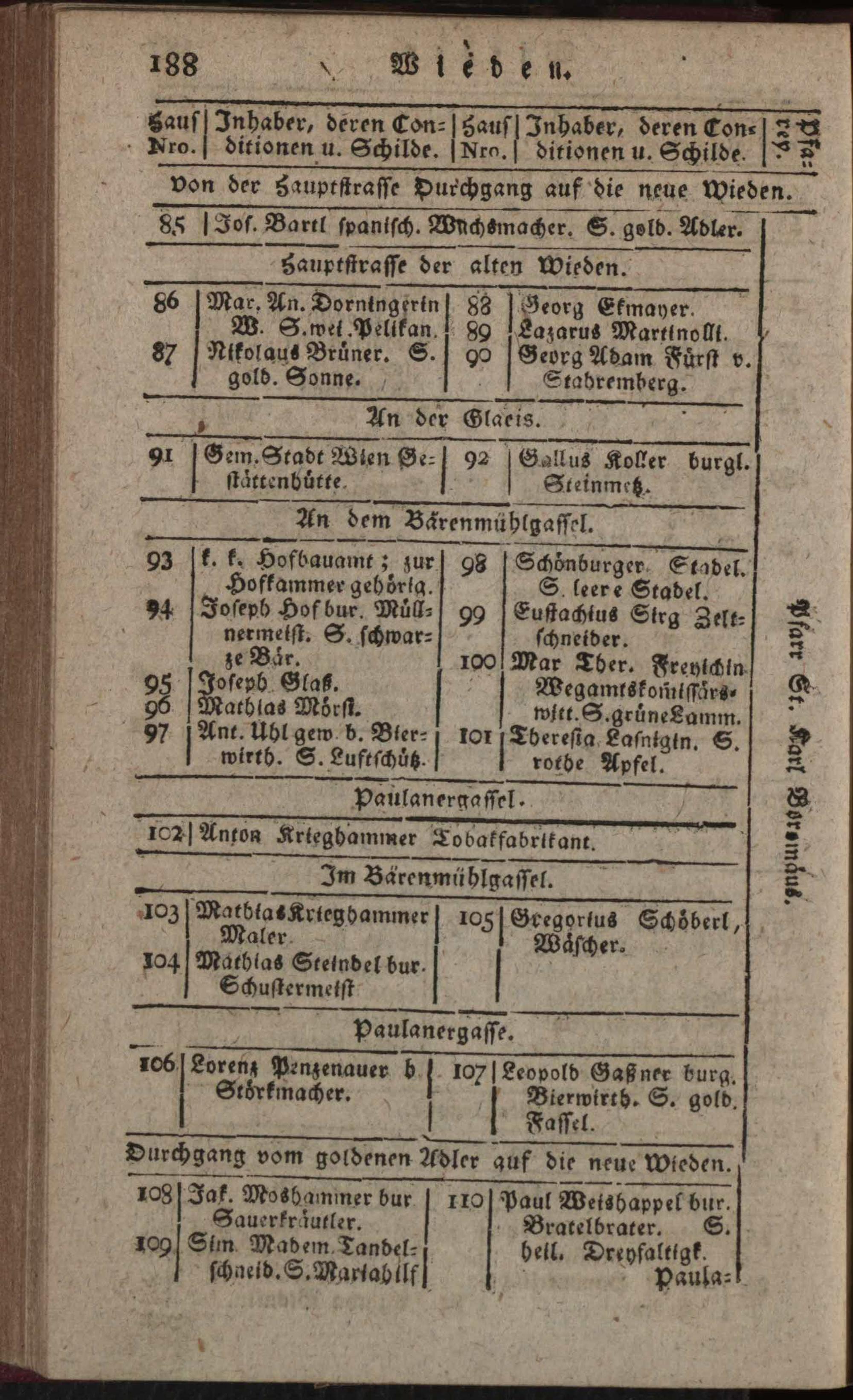 Verzeichniß der in der k. k. Haupt- und Residenzstadt Wien samt den dazu gehörigen Vorstädten und Gründen befindlichen numerirten Häuser, derselben wahrhaften Eigenthümer, deren Konditionen und Schilder : nebst der nach allerhöchster k. k. Verordnung ergangenen neuen Pfarreintheilung ; Auf das genaueste nach den Konskriptions- und herrschaftlichen Grundbüchern von neuem entworfen / von Karl Hofer
