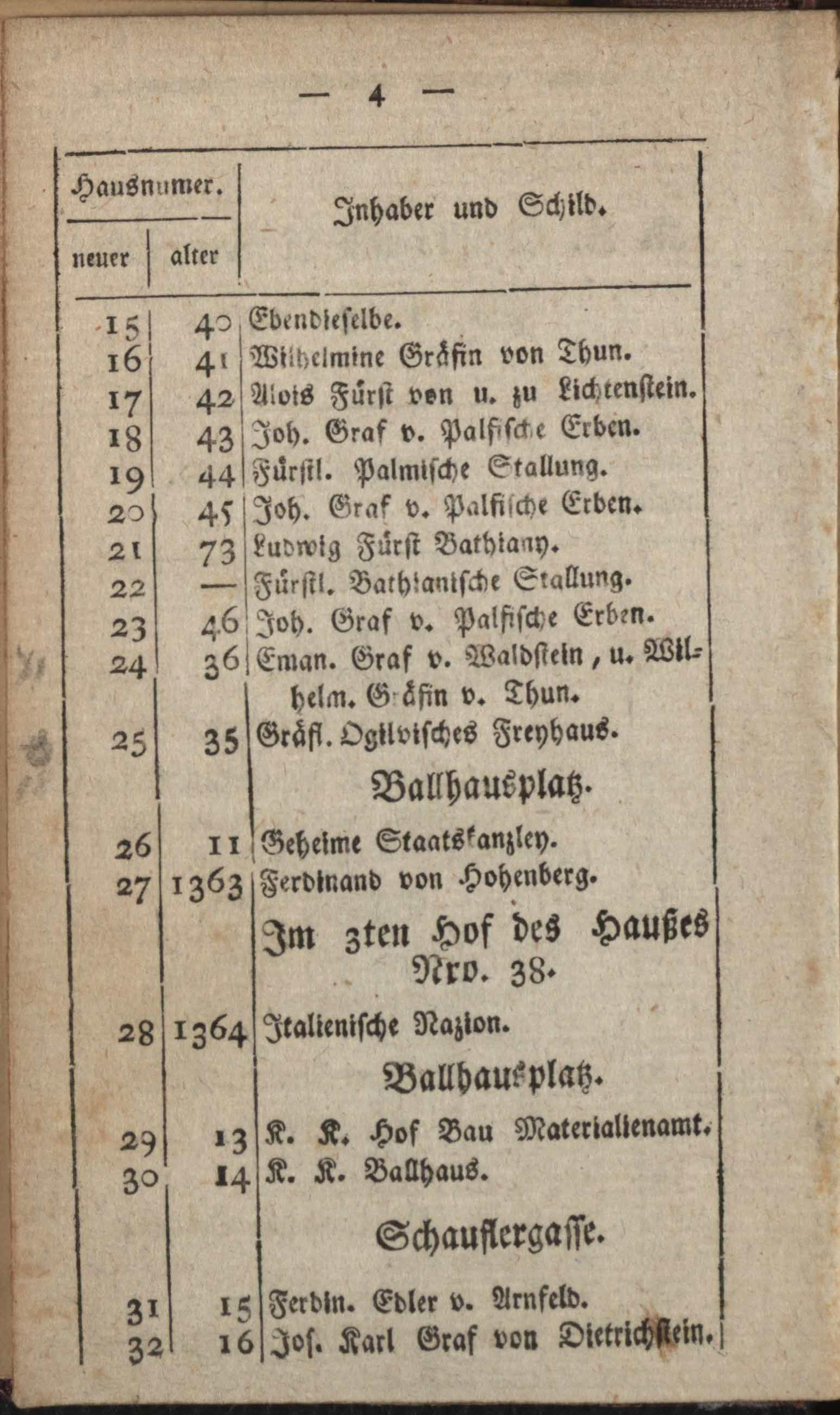 Verzeichniß der in der k. k. Haupt- und Residenzstadt Wien befindlichen numerirten Häuser, derselben wahrhaften Eigenthümer und Schilder : Auf das genaueste nach den Conscriptions- und herrschaftlichen Grundbüchern / von neuem hrsg. von Joh. Karl Schuender