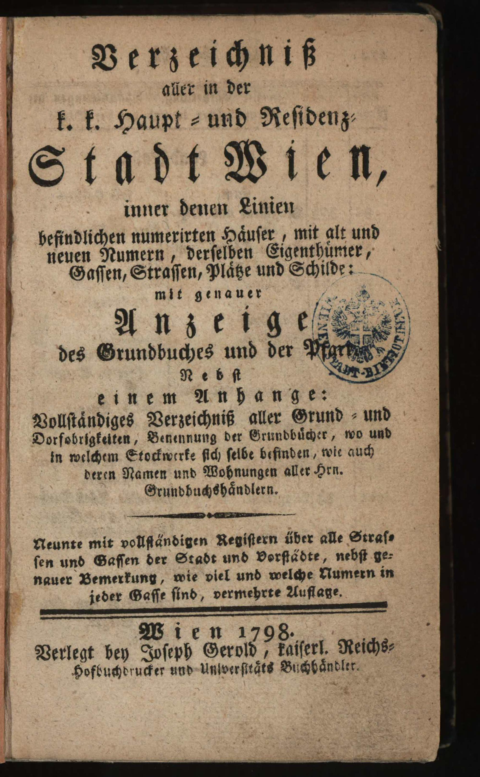 Verzeichniß aller in der k. k. Haupt- und Residenz-Stadt Wien inner denen Linien befindlichen numerirten Häuser : mit alt und neuen Nummern, derselben Eigenthümer, Gassen, Strassen, Plätze und Schilde: mit genauer Anzeige des Grundbuches und der Pfarre ; Nebst einem Anhange: Vollständiges Verzeichniß aller Grund- und Dorfobrigkeiten, Benennung der Grundbücher ...