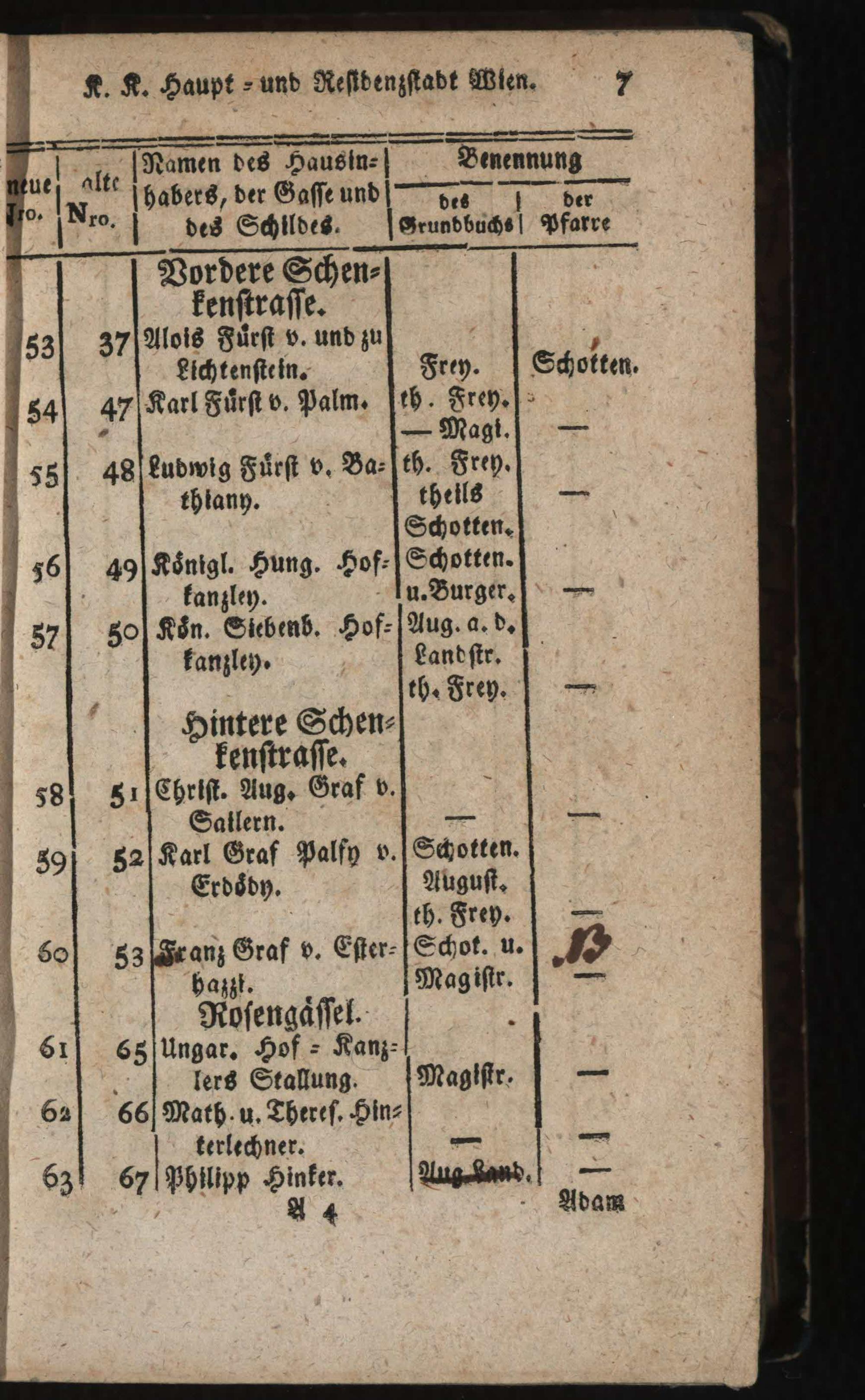 Verzeichniß aller in der k. k. Haupt- und Residenz-Stadt Wien inner denen Linien befindlichen numerirten Häuser : mit alt und neuen Nummern, derselben Eigenthümer, Gassen, Strassen, Plätze und Schilde: mit genauer Anzeige des Grundbuches und der Pfarre ; Nebst einem Anhange: Vollständiges Verzeichniß aller Grund- und Dorfobrigkeiten, Benennung der Grundbücher ...
