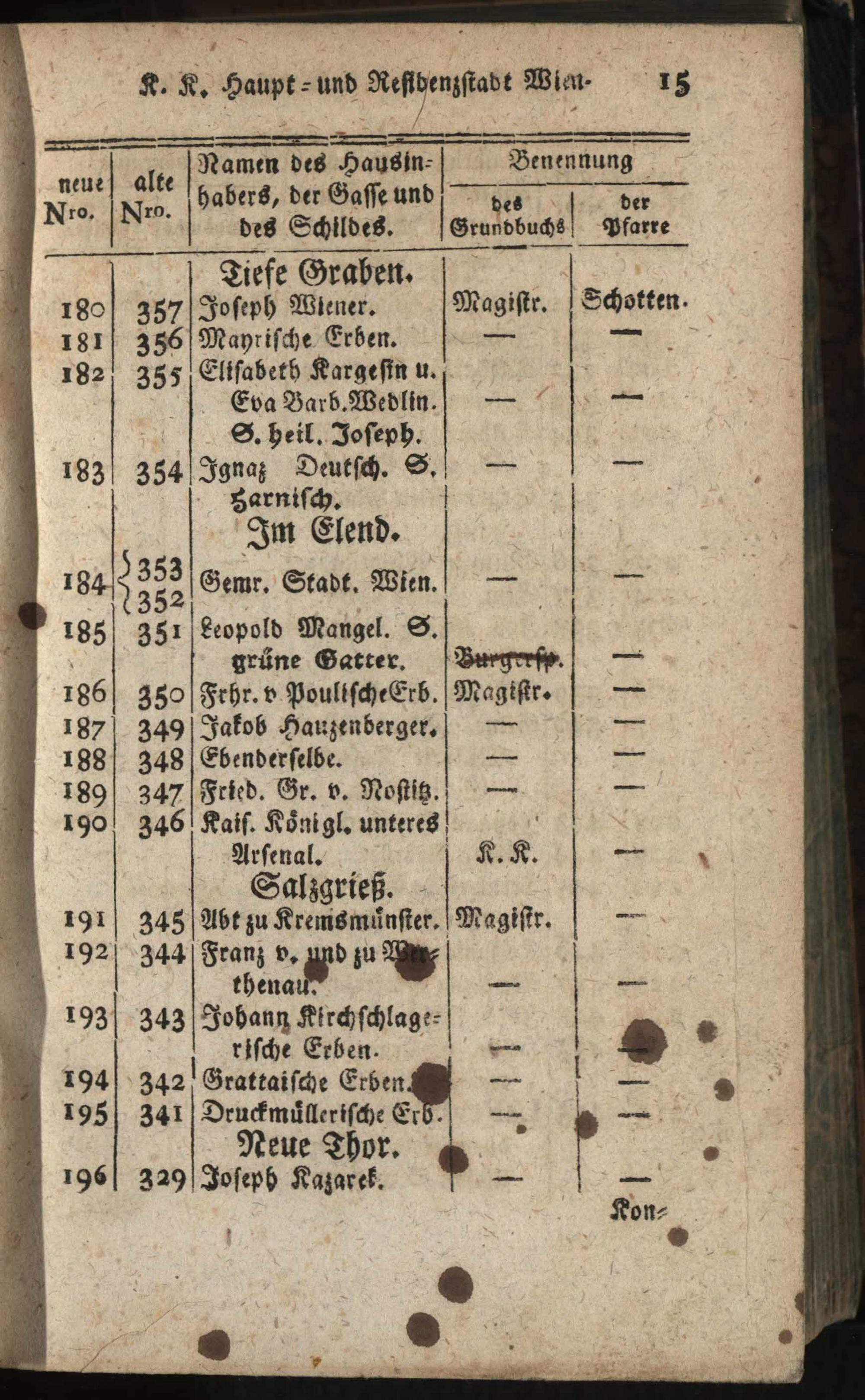 Verzeichniß aller in der k. k. Haupt- und Residenz-Stadt Wien inner denen Linien befindlichen numerirten Häuser : mit alt und neuen Nummern, derselben Eigenthümer, Gassen, Strassen, Plätze und Schilde: mit genauer Anzeige des Grundbuches und der Pfarre ; Nebst einem Anhange: Vollständiges Verzeichniß aller Grund- und Dorfobrigkeiten, Benennung der Grundbücher ...