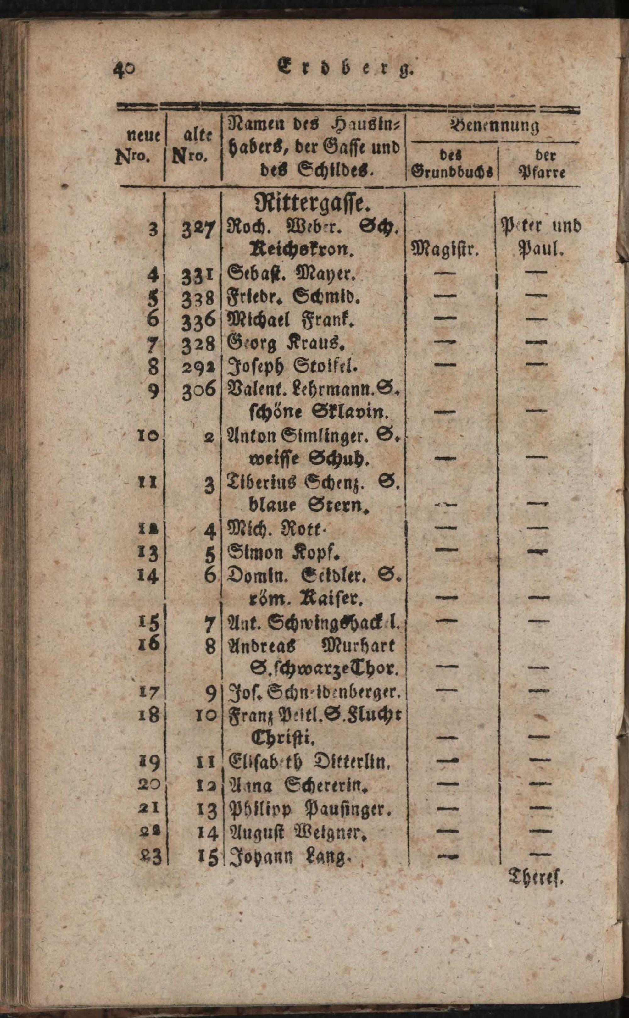Verzeichniß aller in der k. k. Haupt- und Residenz-Stadt Wien inner denen Linien befindlichen numerirten Häuser : mit alt und neuen Nummern, derselben Eigenthümer, Gassen, Strassen, Plätze und Schilde: mit genauer Anzeige des Grundbuches und der Pfarre ; Nebst einem Anhange: Vollständiges Verzeichniß aller Grund- und Dorfobrigkeiten, Benennung der Grundbücher ...
