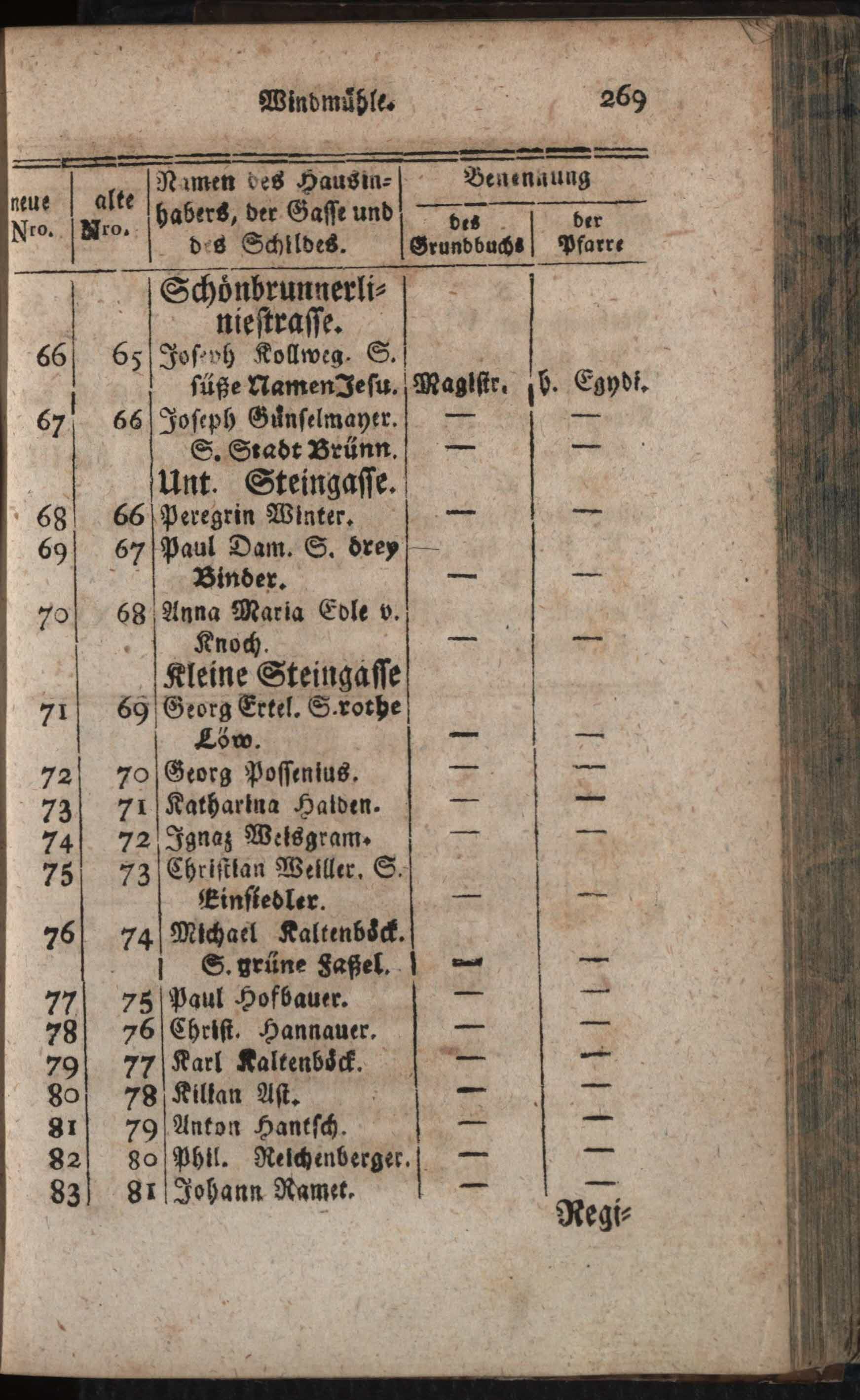 Verzeichniß aller in der k. k. Haupt- und Residenz-Stadt Wien inner denen Linien befindlichen numerirten Häuser : mit alt und neuen Nummern, derselben Eigenthümer, Gassen, Strassen, Plätze und Schilde: mit genauer Anzeige des Grundbuches und der Pfarre ; Nebst einem Anhange: Vollständiges Verzeichniß aller Grund- und Dorfobrigkeiten, Benennung der Grundbücher ...