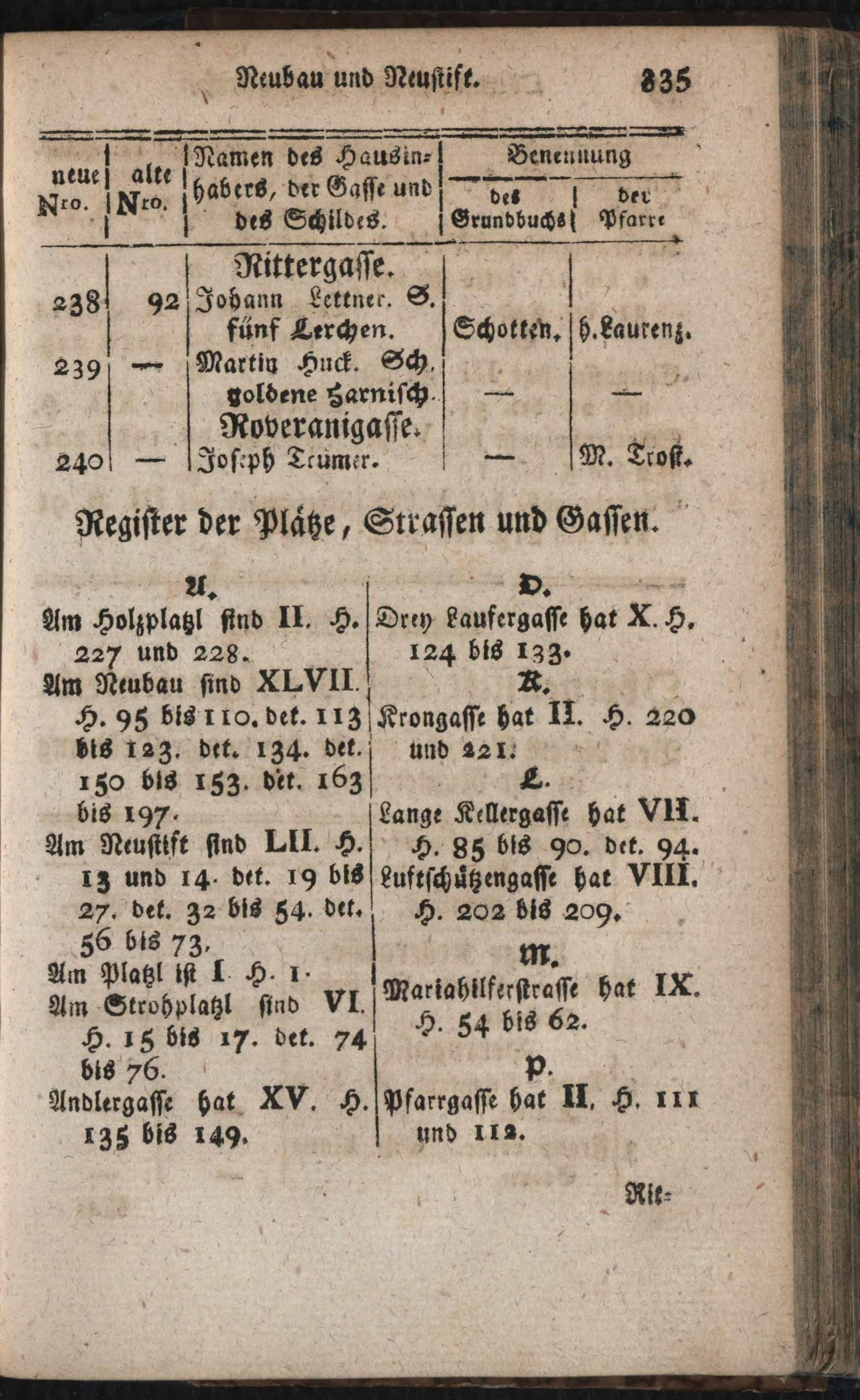 Verzeichniß aller in der k. k. Haupt- und Residenz-Stadt Wien inner denen Linien befindlichen numerirten Häuser : mit alt und neuen Nummern, derselben Eigenthümer, Gassen, Strassen, Plätze und Schilde: mit genauer Anzeige des Grundbuches und der Pfarre ; Nebst einem Anhange: Vollständiges Verzeichniß aller Grund- und Dorfobrigkeiten, Benennung der Grundbücher ...