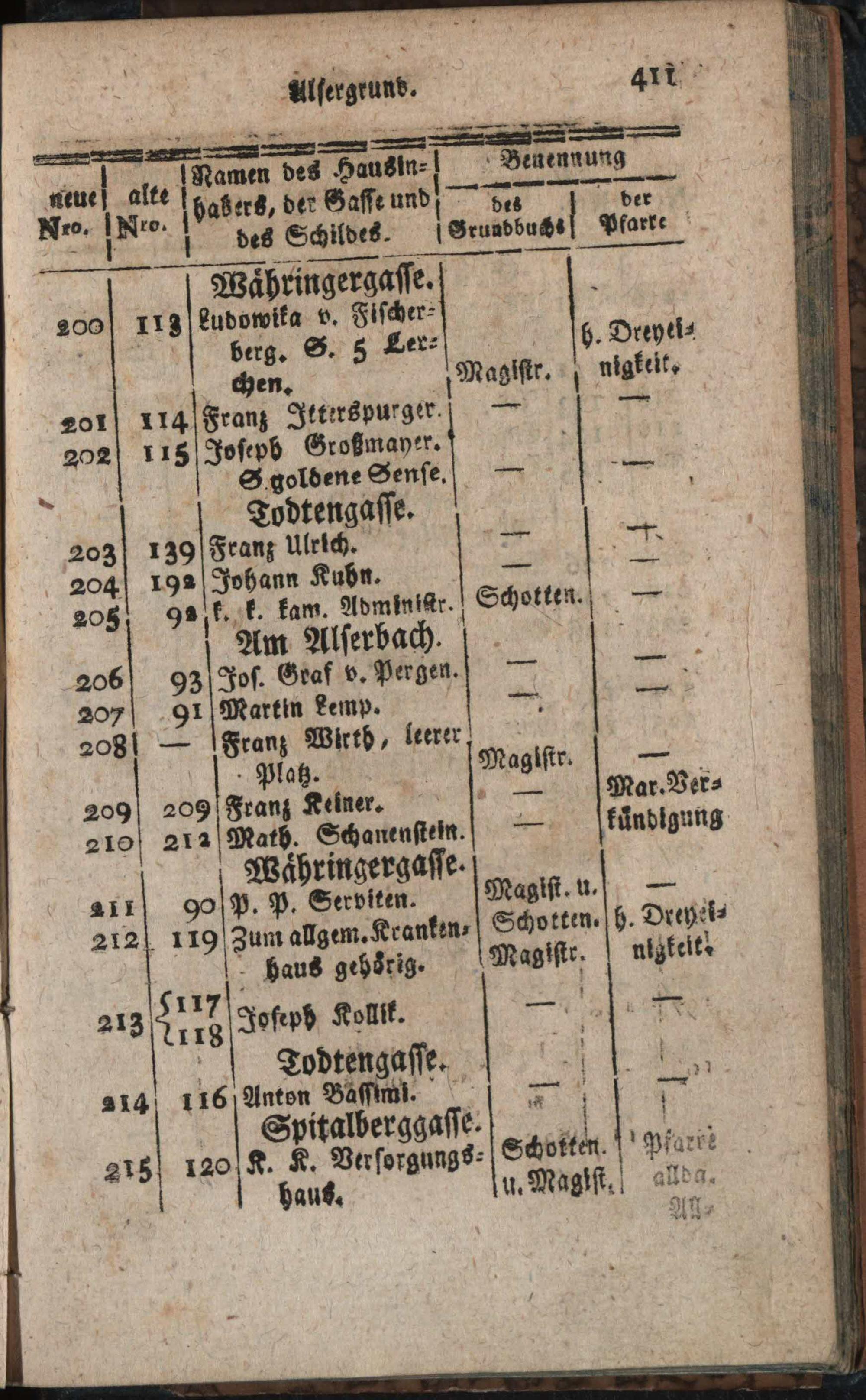 Verzeichniß aller in der k. k. Haupt- und Residenz-Stadt Wien inner denen Linien befindlichen numerirten Häuser : mit alt und neuen Nummern, derselben Eigenthümer, Gassen, Strassen, Plätze und Schilde: mit genauer Anzeige des Grundbuches und der Pfarre ; Nebst einem Anhange: Vollständiges Verzeichniß aller Grund- und Dorfobrigkeiten, Benennung der Grundbücher ...
