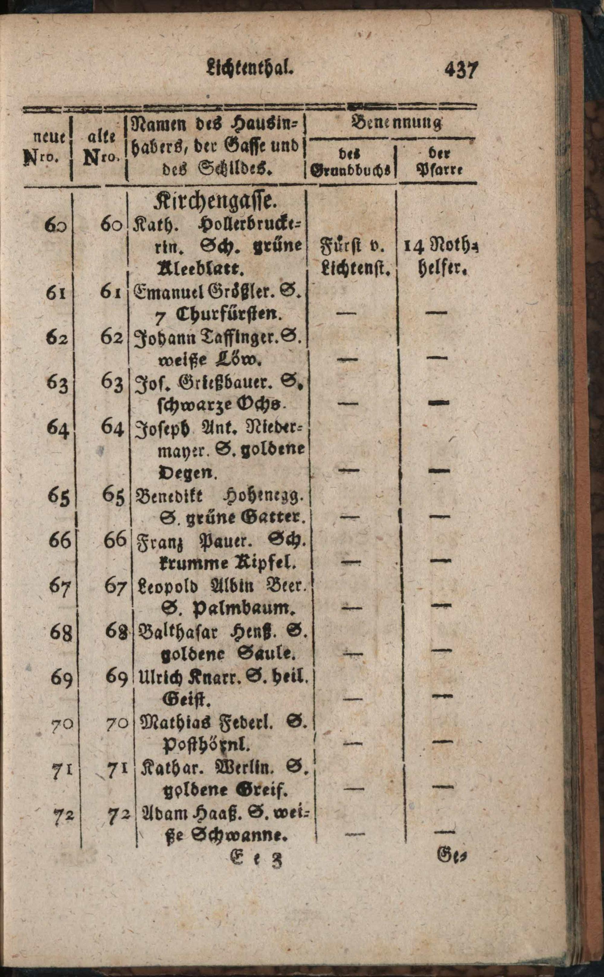 Verzeichniß aller in der k. k. Haupt- und Residenz-Stadt Wien inner denen Linien befindlichen numerirten Häuser : mit alt und neuen Nummern, derselben Eigenthümer, Gassen, Strassen, Plätze und Schilde: mit genauer Anzeige des Grundbuches und der Pfarre ; Nebst einem Anhange: Vollständiges Verzeichniß aller Grund- und Dorfobrigkeiten, Benennung der Grundbücher ...