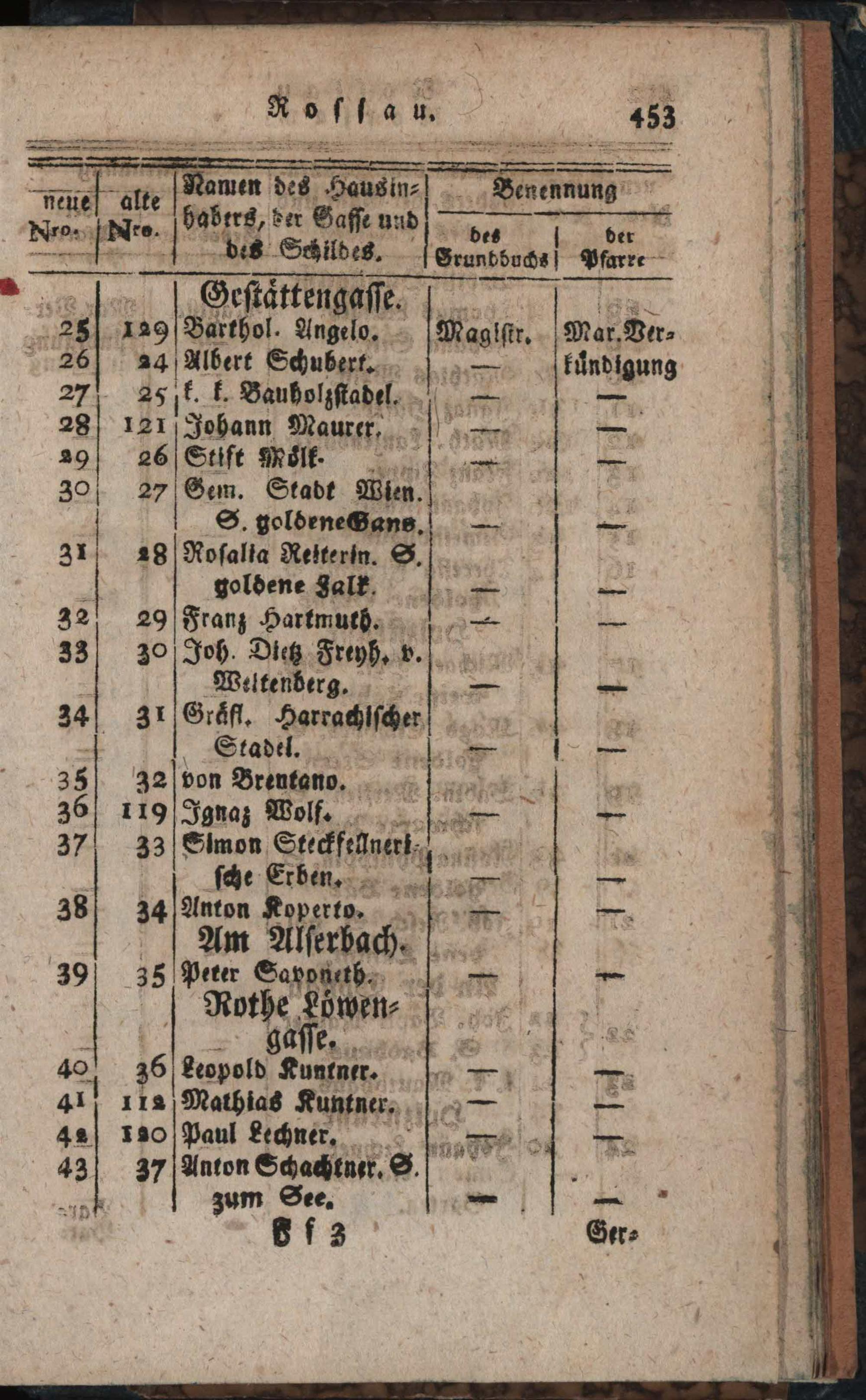 Verzeichniß aller in der k. k. Haupt- und Residenz-Stadt Wien inner denen Linien befindlichen numerirten Häuser : mit alt und neuen Nummern, derselben Eigenthümer, Gassen, Strassen, Plätze und Schilde: mit genauer Anzeige des Grundbuches und der Pfarre ; Nebst einem Anhange: Vollständiges Verzeichniß aller Grund- und Dorfobrigkeiten, Benennung der Grundbücher ...