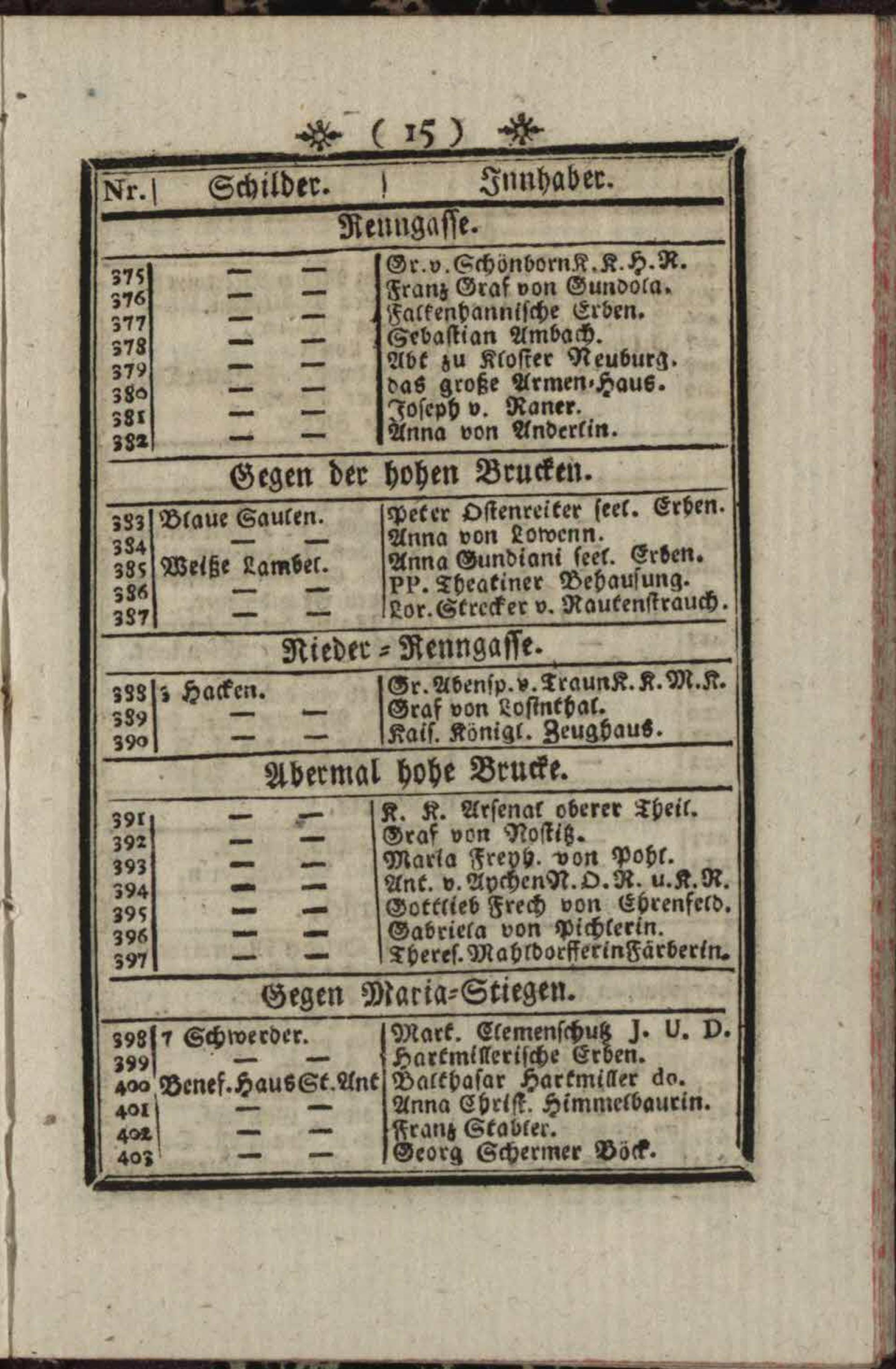 Verzeichniß der in der k. k. Haupt- und Residenz-Stadt Wien befindlichen Gassen, Hausinnhabern deren Schildern und numerirten Häusern