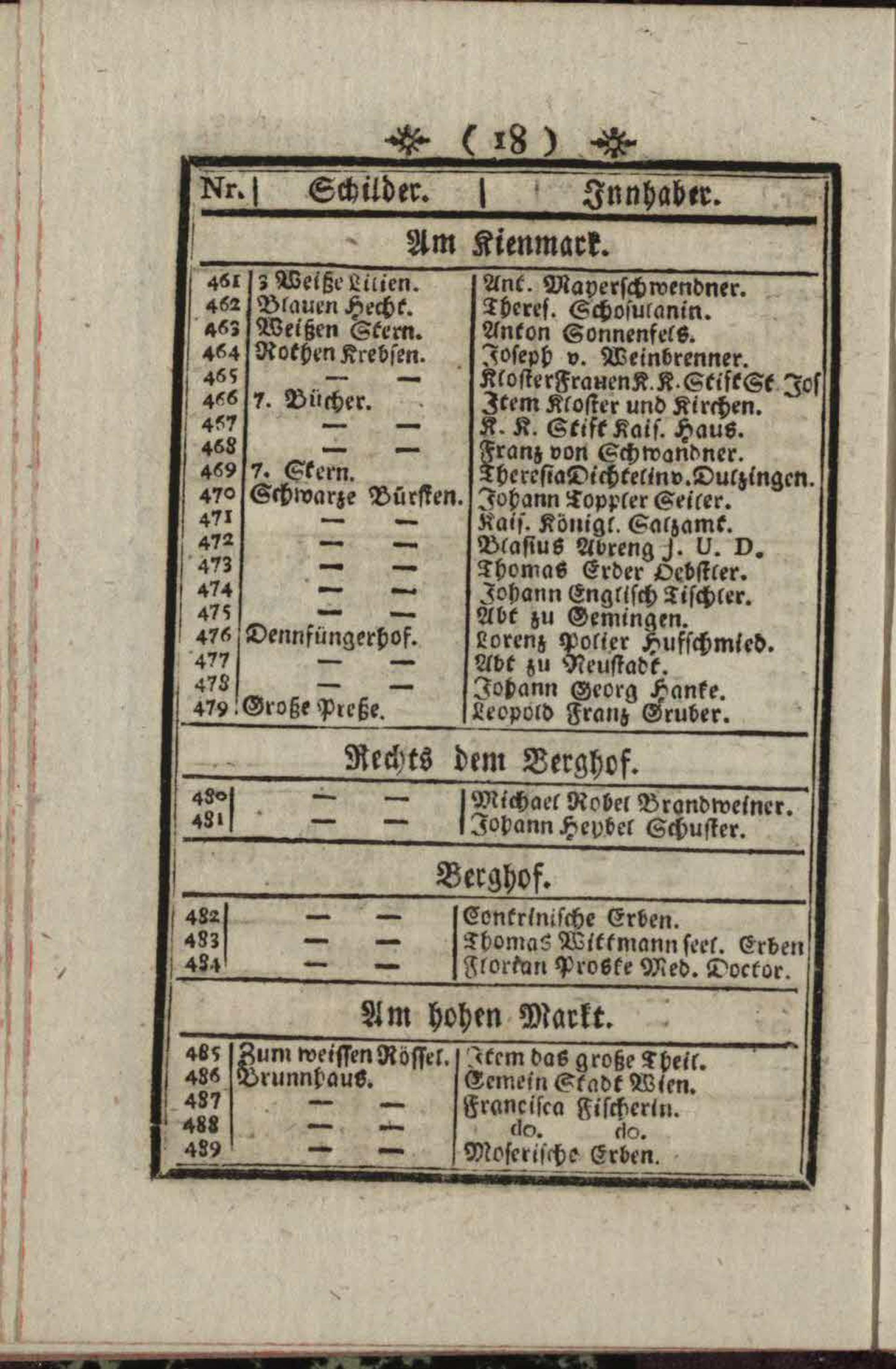 Verzeichniß der in der k. k. Haupt- und Residenz-Stadt Wien befindlichen Gassen, Hausinnhabern deren Schildern und numerirten Häusern