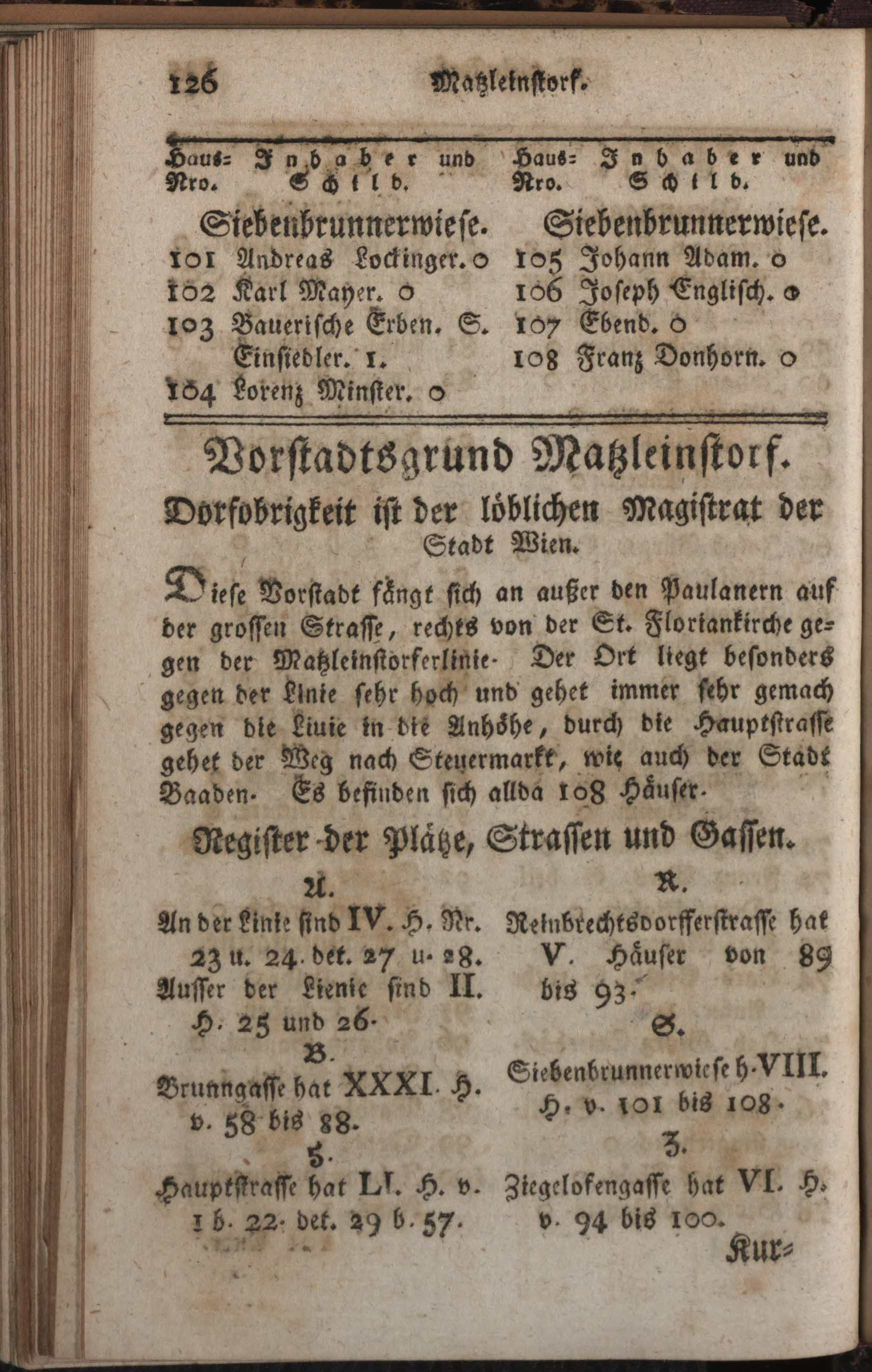 Verzeichniß der in der k. k. Haupt- und Residenz-Stadt Wien, sammt den dazu gehörigen Vorstädten und Gründen, befindlichen numerirten Häuser, derselben wahrhafte Eigenthümer und Schilde : Auch einer Anzeige wie viel Stockwerke jedes Haus hat, nebst einer kurzen Uebersicht der alt und neuen Häusernumerirung und einem bequemen Register über die Plätze, Strassen und Gässen