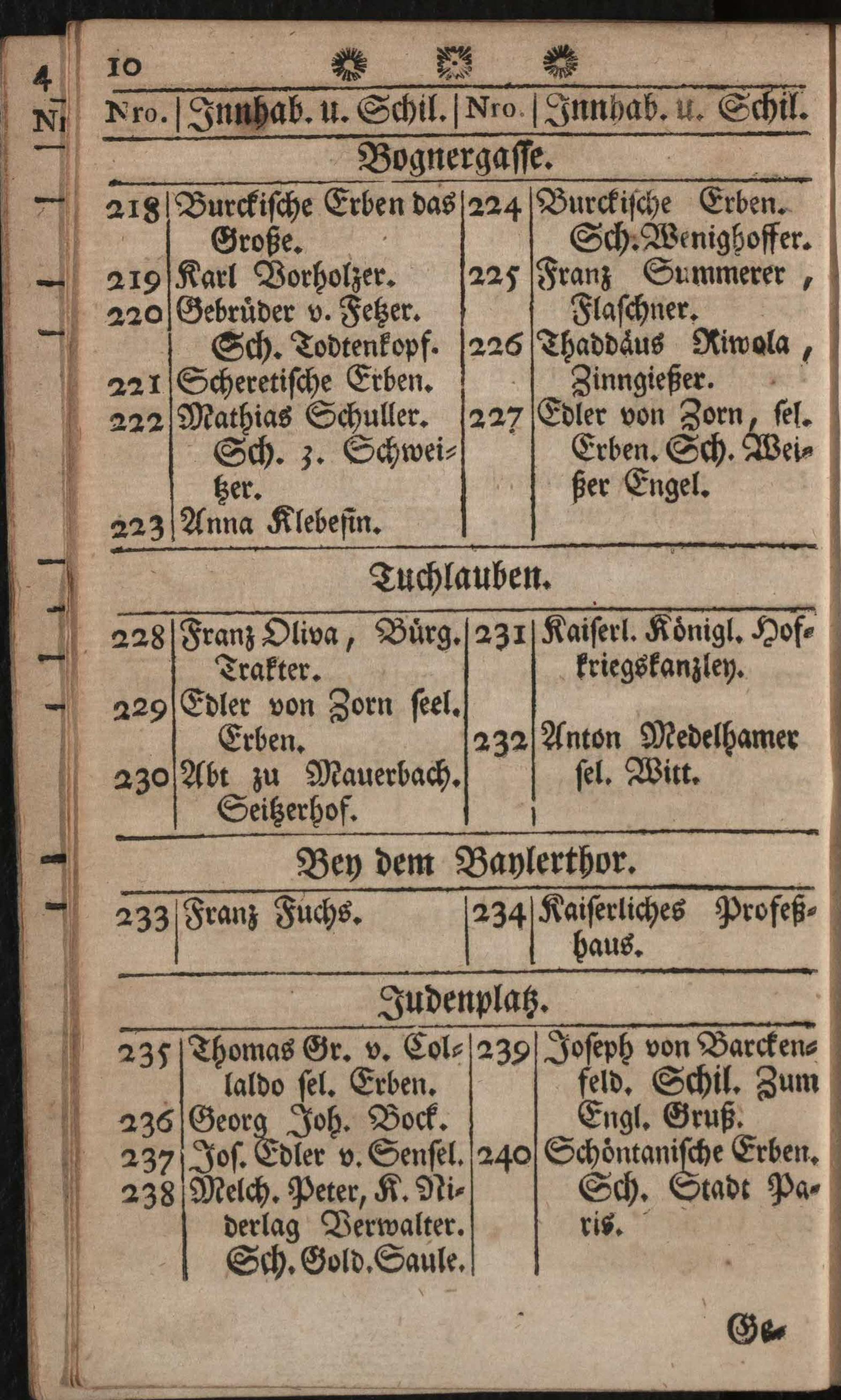 Verzeichniß der in der k. k. Haupt- und Residenzstadt Wien befindlichen Gassen, numerirten Häuser, Innhaber, und ihrer Schilde : sammt einer neuen verbesserten und zum sichersten Gebrauch bequem eingerichten Rechnungstabelle, worinn die Dukaten und Souveraind'ors, dann Niederländer Kronthaler, und Gulden, wie auch Siebenzehner und Siebner, zu fünf auf einen Wurf, alles von 1 bis 1000 enthalten sind