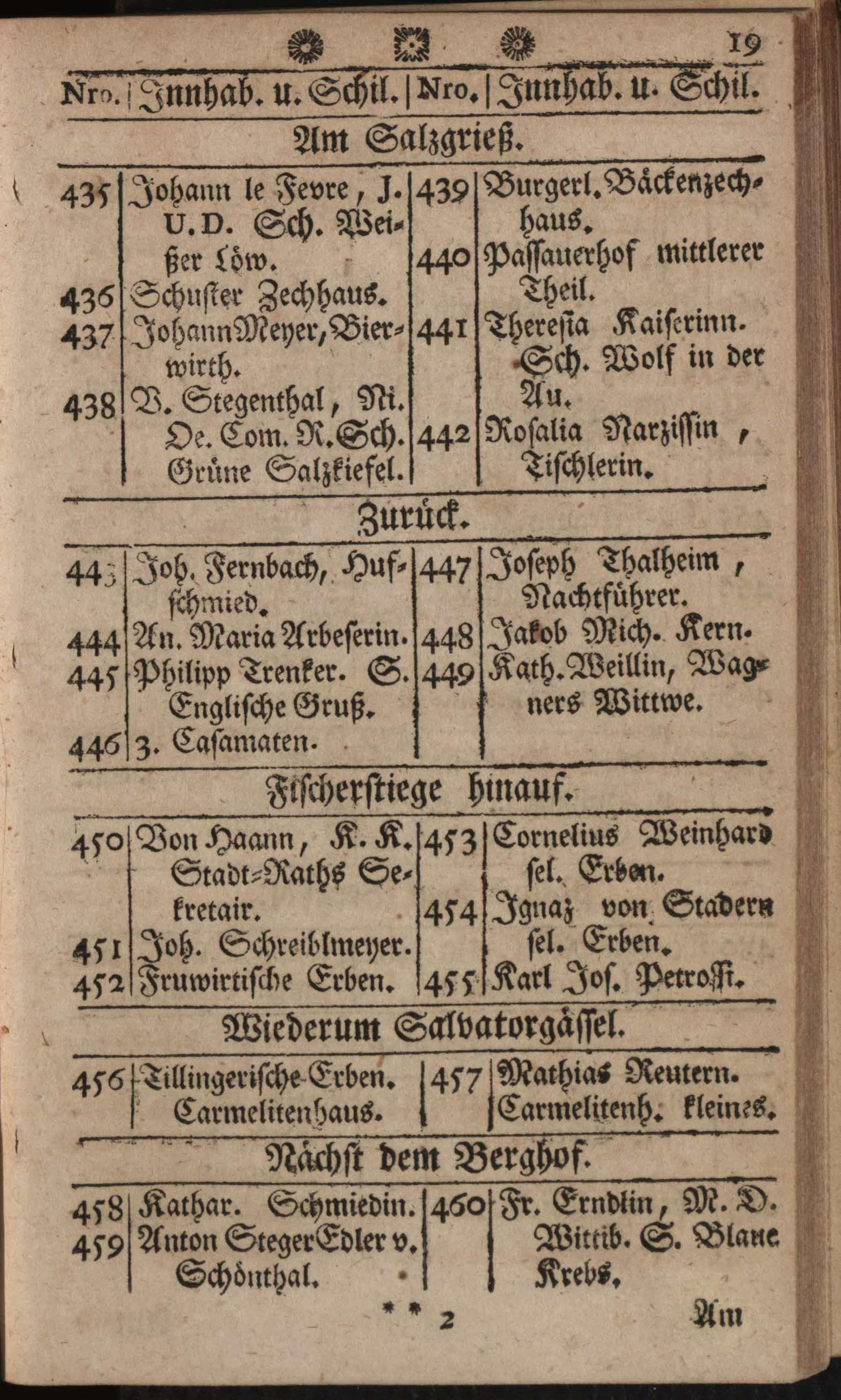 Verzeichniß der in der k. k. Haupt- und Residenzstadt Wien befindlichen Gassen, numerirten Häuser, Innhaber, und ihrer Schilde : sammt einer neuen verbesserten und zum sichersten Gebrauch bequem eingerichten Rechnungstabelle, worinn die Dukaten und Souveraind'ors, dann Niederländer Kronthaler, und Gulden, wie auch Siebenzehner und Siebner, zu fünf auf einen Wurf, alles von 1 bis 1000 enthalten sind