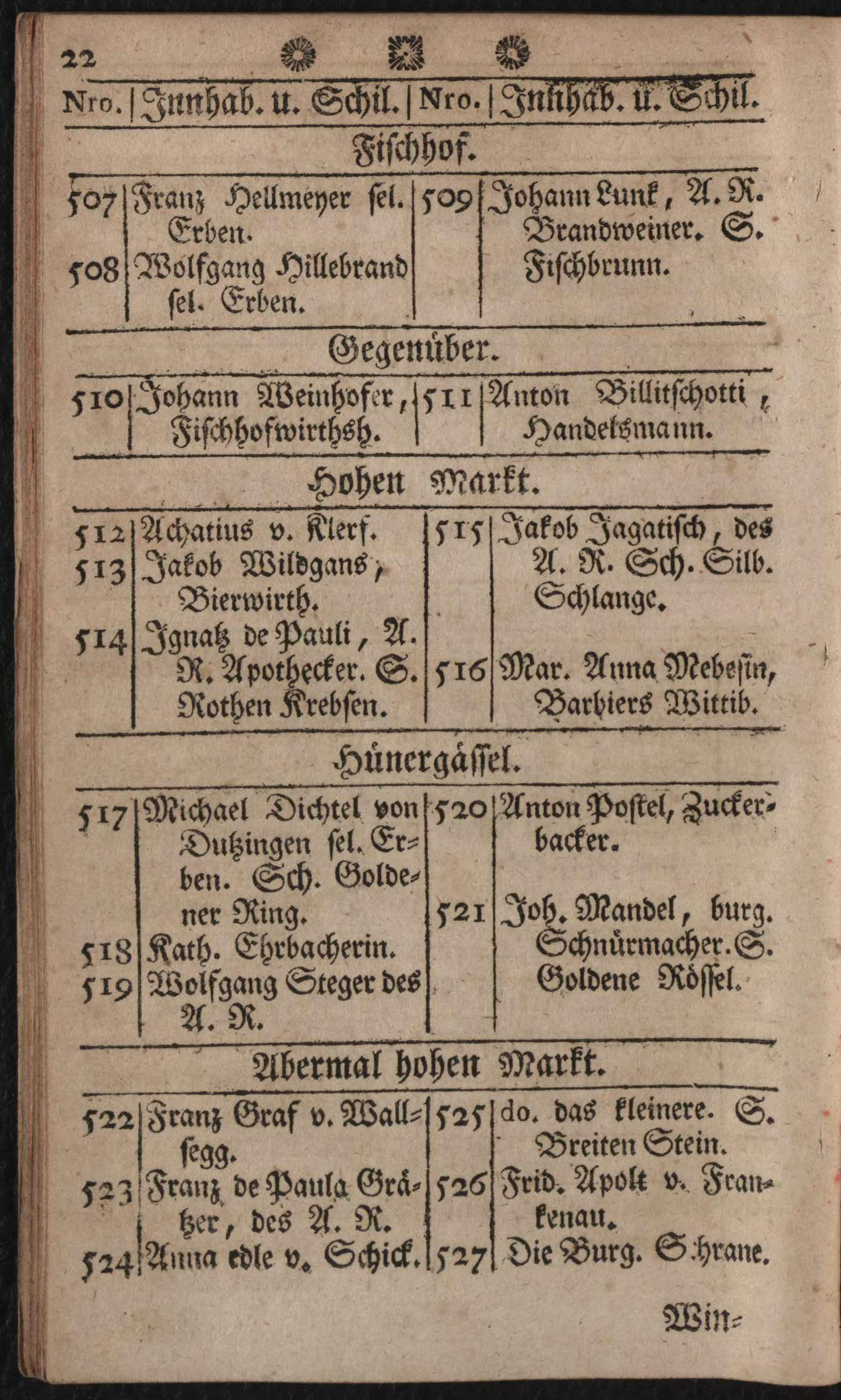 Verzeichniß der in der k. k. Haupt- und Residenzstadt Wien befindlichen Gassen, numerirten Häuser, Innhaber, und ihrer Schilde : sammt einer neuen verbesserten und zum sichersten Gebrauch bequem eingerichten Rechnungstabelle, worinn die Dukaten und Souveraind'ors, dann Niederländer Kronthaler, und Gulden, wie auch Siebenzehner und Siebner, zu fünf auf einen Wurf, alles von 1 bis 1000 enthalten sind